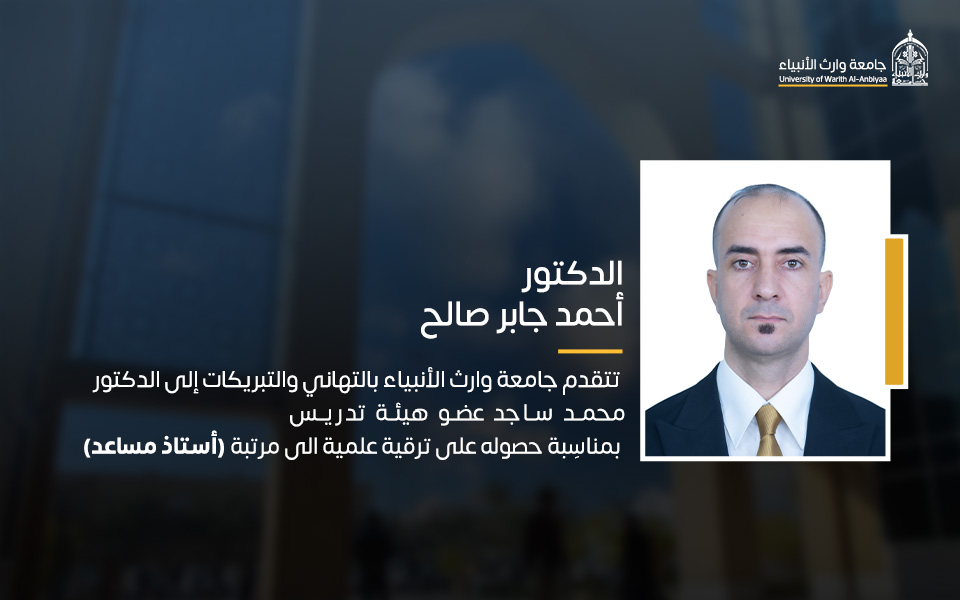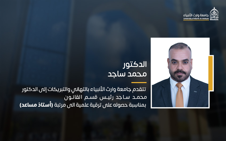 تتقدم رئاسة جامعة وارث الأنبياء (عليه السلام) بالتهنئة إلى الدكتور أحمد صبري، المعاون الإداري لعميد كلية القانون، والدكتور محمد ساجد، رئيس قسم القانون، والدكتور أحمد جابر، أمين مجلس الجامعة، بمناسبة ترقيتهم إلى مرتبة "أستاذ مساعد".