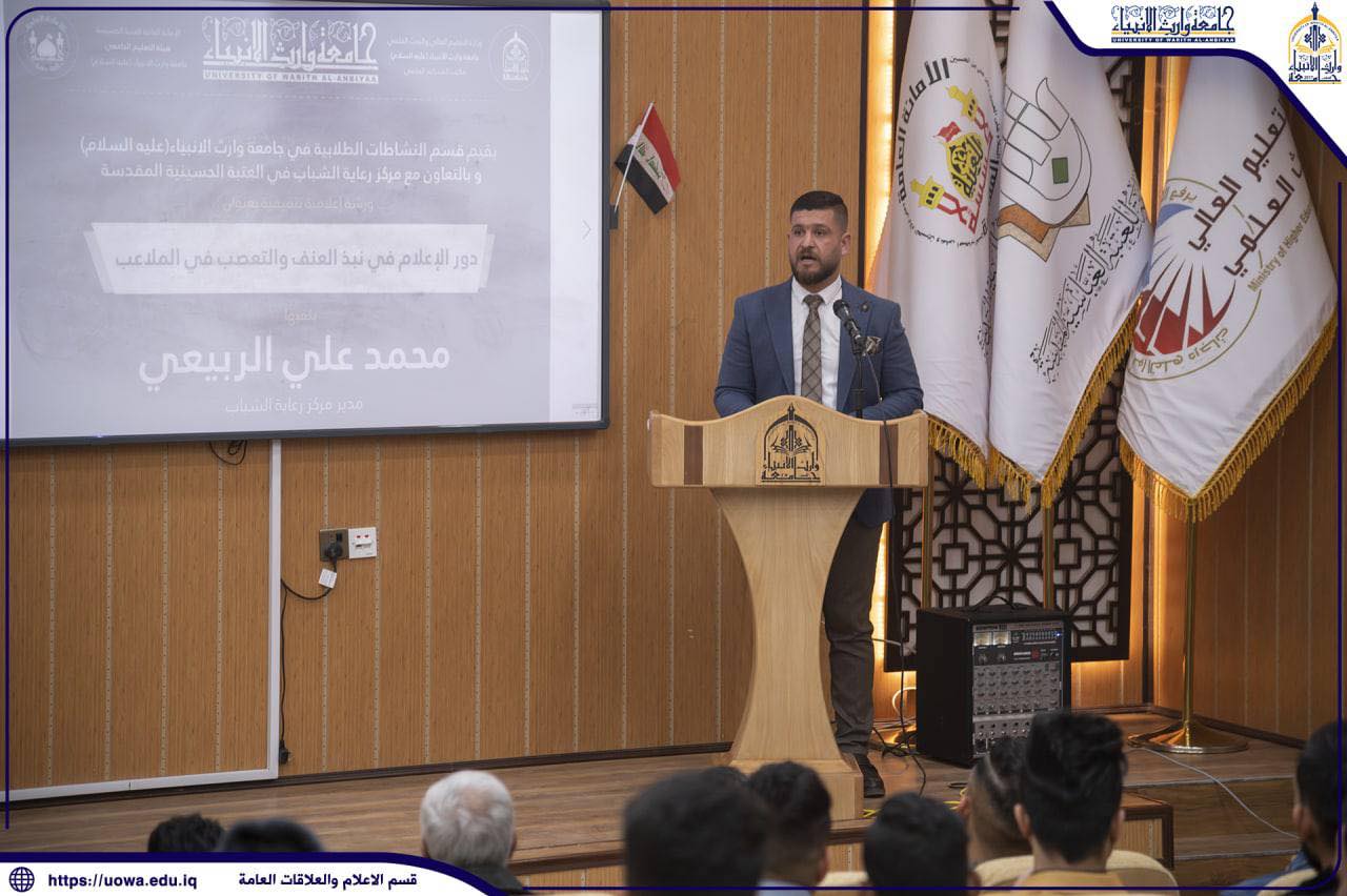 أقام قسم النشاطات الطلابية في جامعة وارث الأنبياء(عليه السلام) وبالتعاون مع مركز رعاية الشباب التابع للعتبة الحسينية المقدسة ورشة إعلامية تثقيفية بعنوان(دور الاعلام في نبذ العنف والتعصب في الملاعب) قدمها السيد محمد علي الربيعي مدير مركز رعاية الشباب