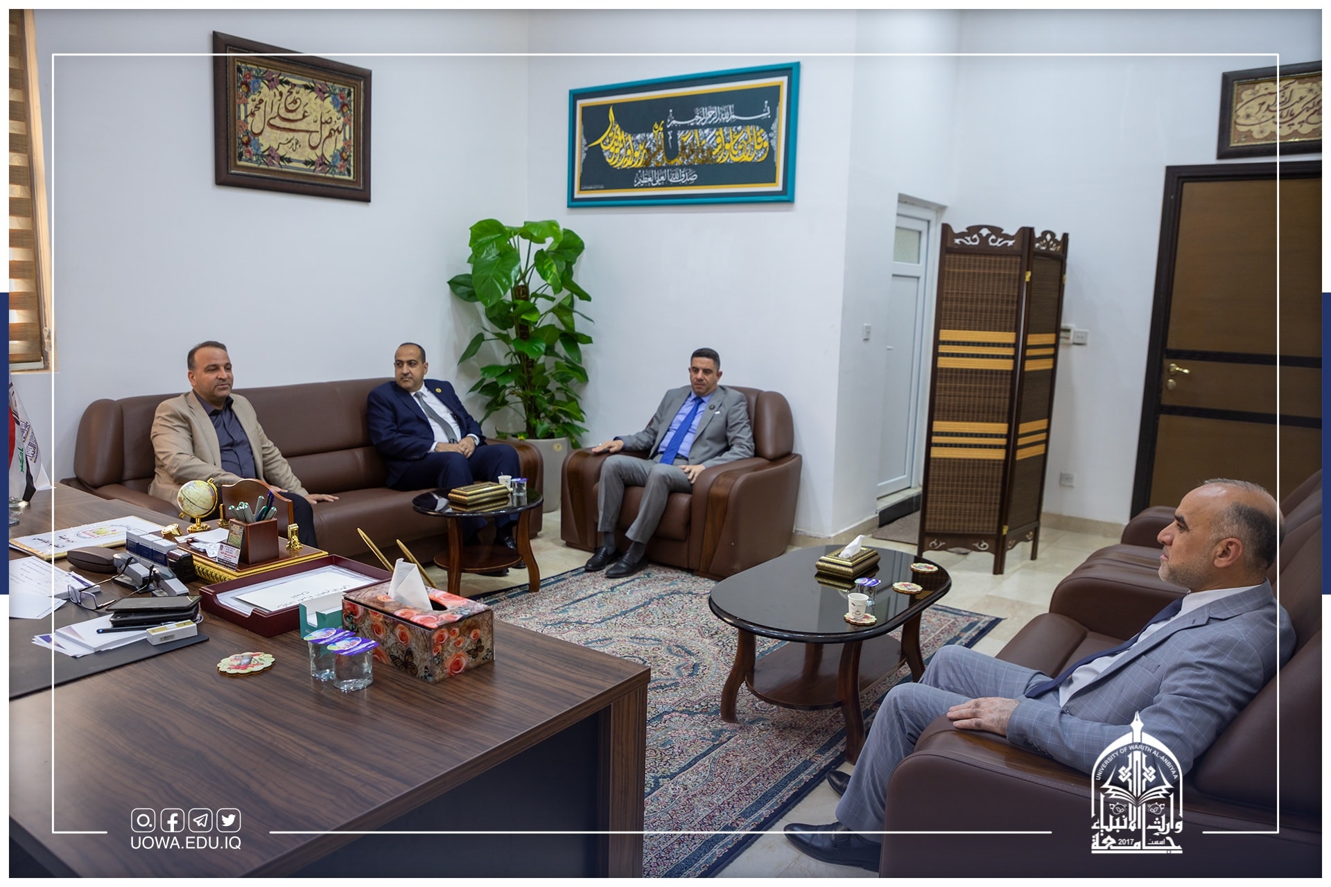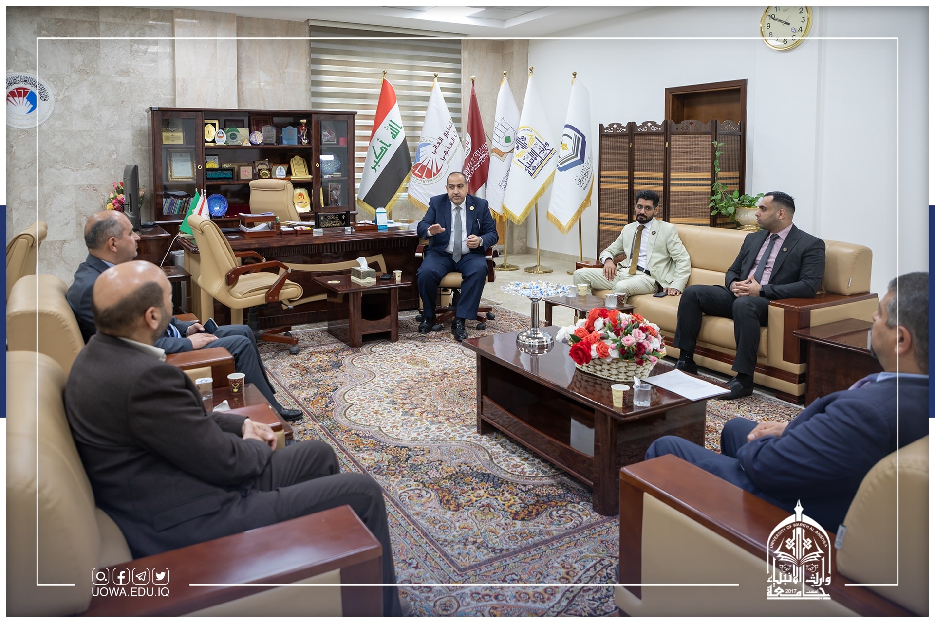 استقبل السيد رئيس هيأة التعليم الجامعي الأستاذ الدكتور حيدر التميمي والسيد رئيس الجامعة الاستاذ الدكتور ابراهيم الحياوي، الوفد الوزاري المكلف بمتابعة الامتحانات لطلبة كليات وأقسام الجامعة، وأشاد الوفد بالامكانيات العلمية والمادية التي تمتلكها الجامعة والانسيابية العالية بأداء الامتحانات النهائية.