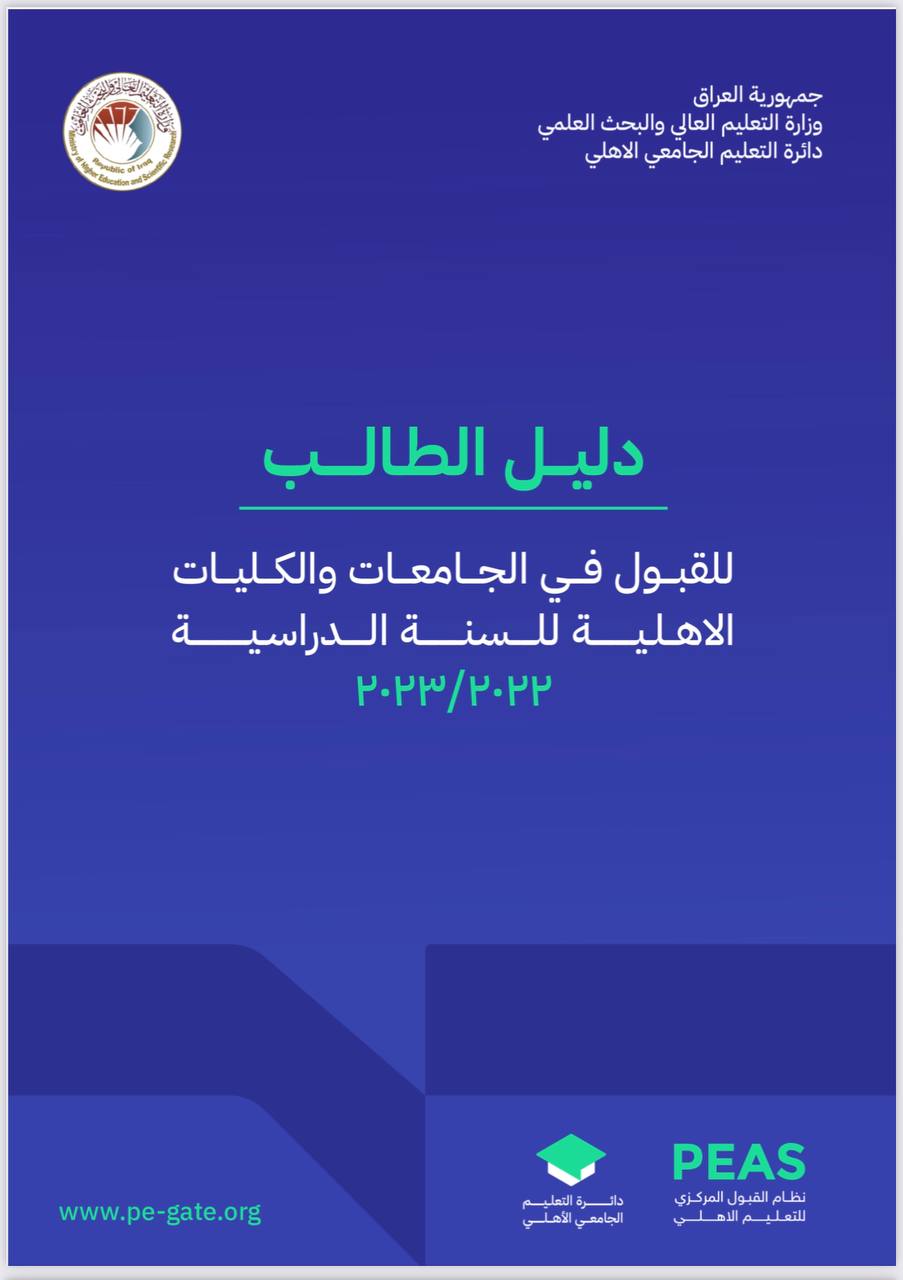 تعلن وزارة التعليم العالي والبحث العلمي إطلاق دليل الطالب للقبول في الجامعات والكليات الأهلية للسنة الدراسية 2023/2022.