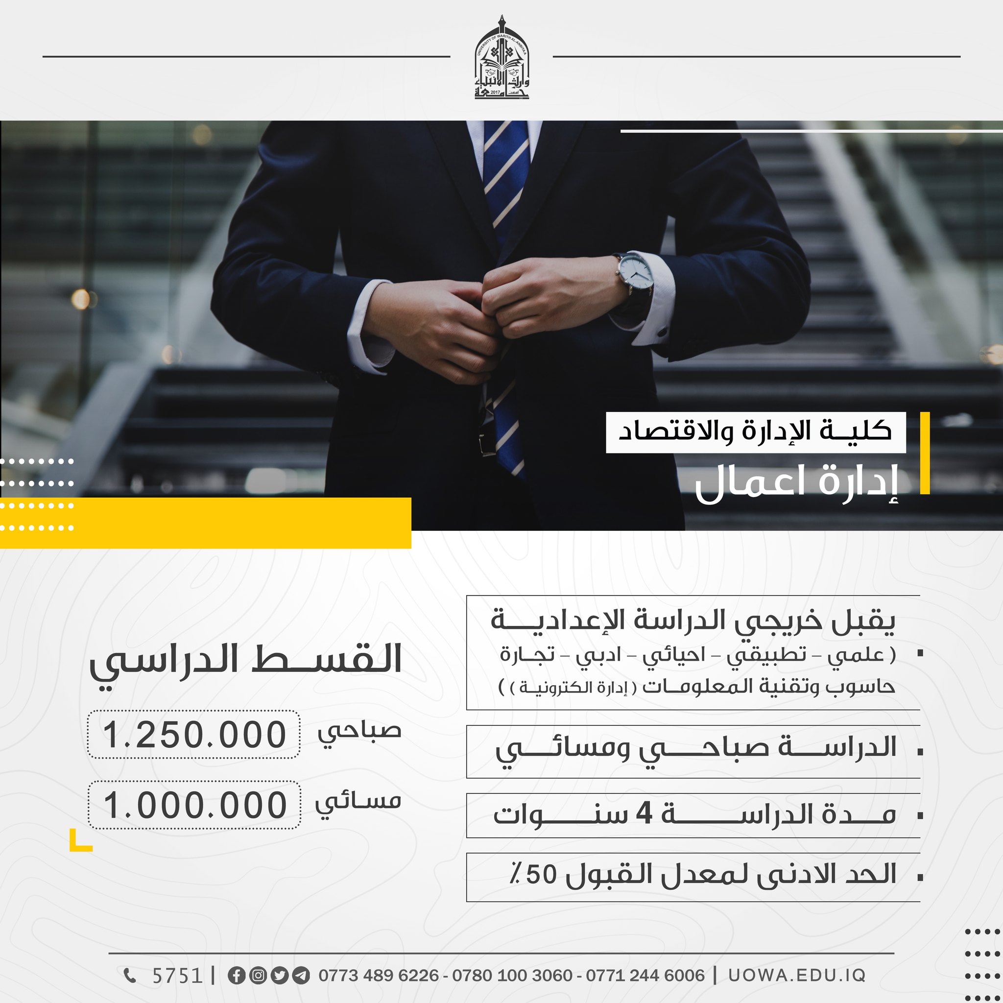 (عدا كلية الطب) اعزاءنا الطلبة الراغبين بالتسجيل في كليات واقسام جامعة وارث الانبياء(عليه السلام) (عدا كلية الطب) مراجعة الجامعة ابتداءً من السبت، إذ سيكون فريق التسجيل بانتظاركم من الساعة( ٨ ) صباحاً ولغاية( ٥ ) مساءً