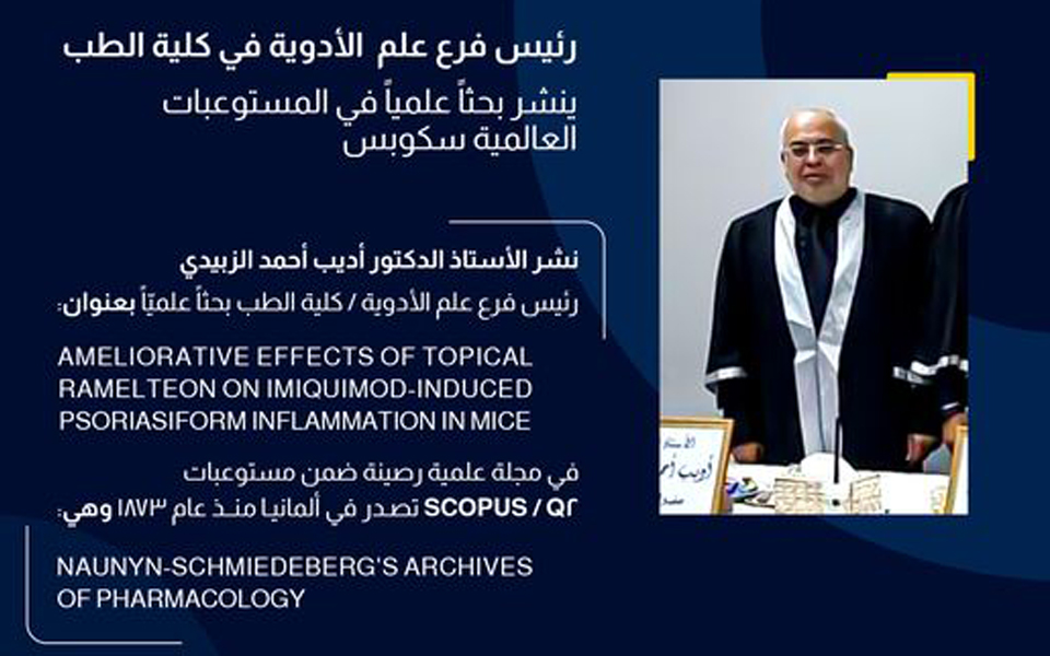 نشر الأستاذ الدكتور أديب أحمد الزبيدي، رئيس فرع علم الأدوية في كلية الطب، بحثًا علميًا بعنوان "Ameliorative effects of topical ramelteon on imiquimod-induced psoriasiform inflammation in mice" في مجلة علمية مرموقة تندرج ضمن مستوعبات Scopus، ما يعكس الأهمية العلمية والبحثية للدراسة.