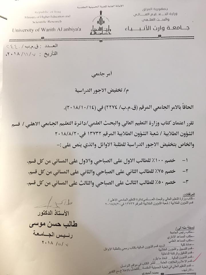 قررت رئاسة#جامعةوارث_الانبياء_التابعة_للعتبة_الحسينية_المقدسة وحسب كتاب وزارة التعليم العالي والبحث العلمي بتخفيض الأجور للطلبة الاوائل وكالاتي:١.خصم ١٠٠٪ للطالب الاول على الصباحي والطالب الاول على المسائي2. خصم ٧٥٪ للطالب الثاني على الصباحي والثاني على المسائي3. خصم ٥٠٪ للطالب الثالث على الصباحي والثالث على المسائي.