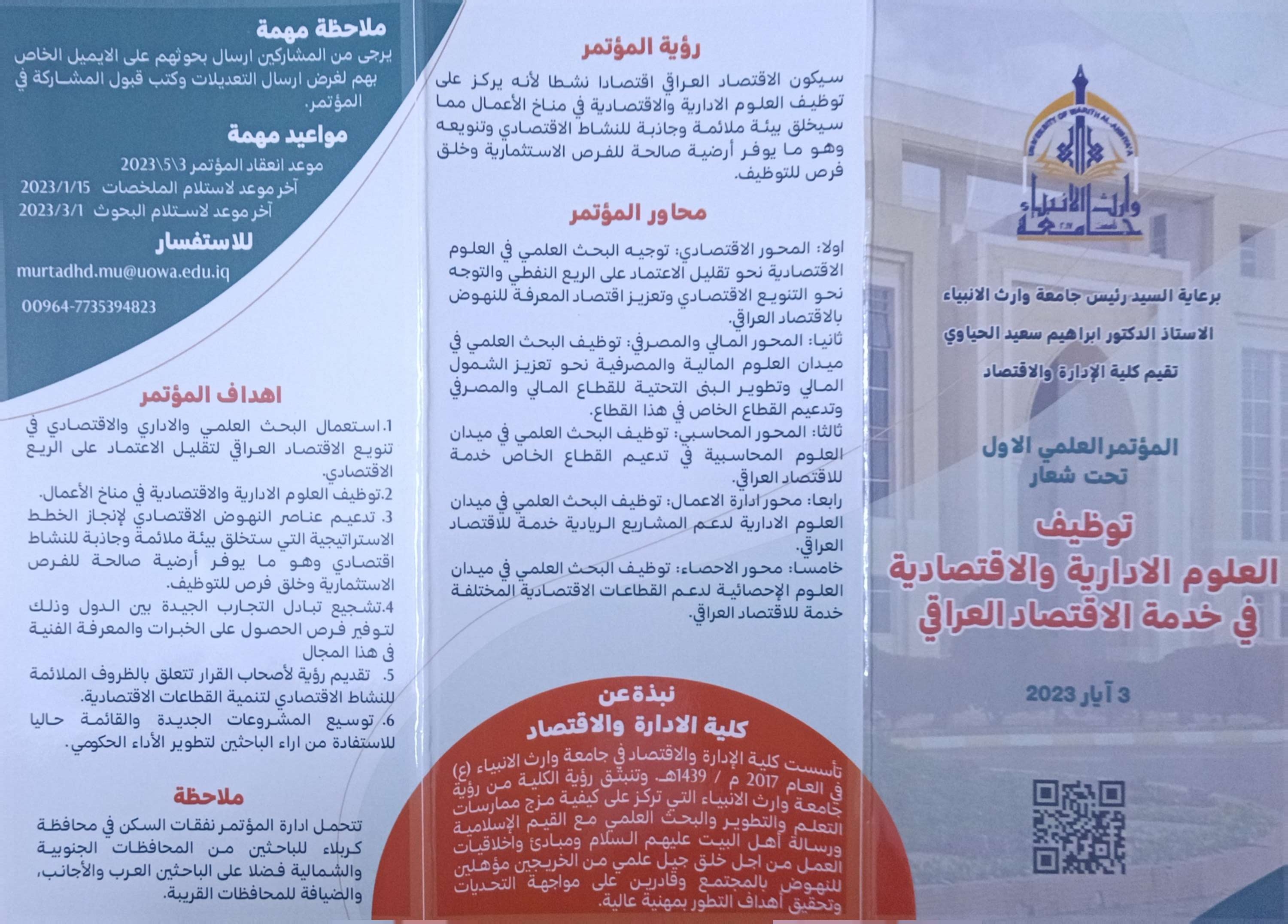 تقيم كلية الادارة والاقتصاد مؤتمرها العلمي الدولي الاول تحت شعار توظيف  العلوم الادارية والاقتصادية في خدمة الاقتصاد العراقي في تأريخ 3 -5-2023