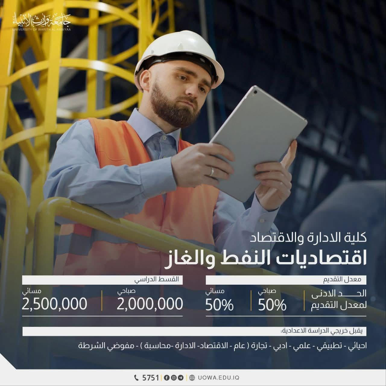 اكتشف مدخلات القبول والمعدلات المطلوبة لأقسام كليات الادارة والاقتصاد في جامعة وارث الانبياء (ع)