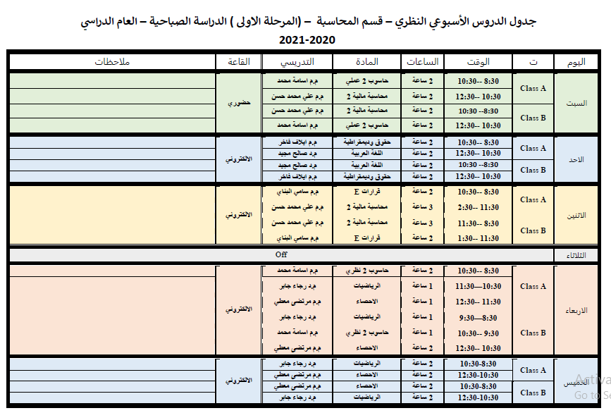 جدول الدروس الاسبوعي للكورس الثاني لقسم المحاسبة الدراسة الصباحية