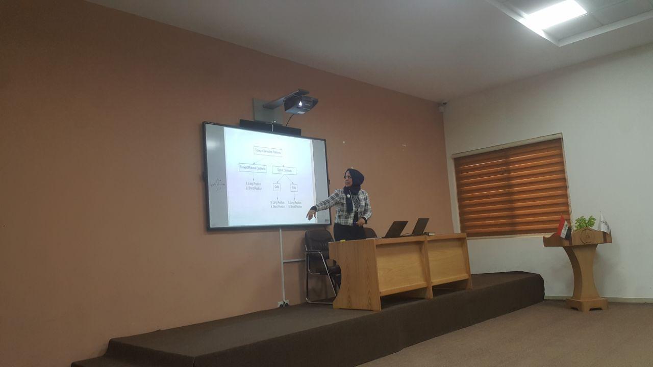 أقام قسم ادارة الاعمال في كلية الادارة والاقتصاد حلقة نقاشية بعنوان (المشتقات المالية) قام بألقائها الاستاذ (م.د هبة الله مصطفى) يوم الاربعاء المصادف 2\1\2019وقد حضر الجلسة كل من سيادة عميد الكلية أ.د.عامر العطوي و رئيس قسم المحاسبة م.د.فهد الشمري  والسادة التدريسيين  وقد ركزت الورشة على توضيح مفهوم المشتقات المالية وطريقة انشائها وكيفية توظيفها لخدمة الجانب التعليمي لطلبة كليتنا