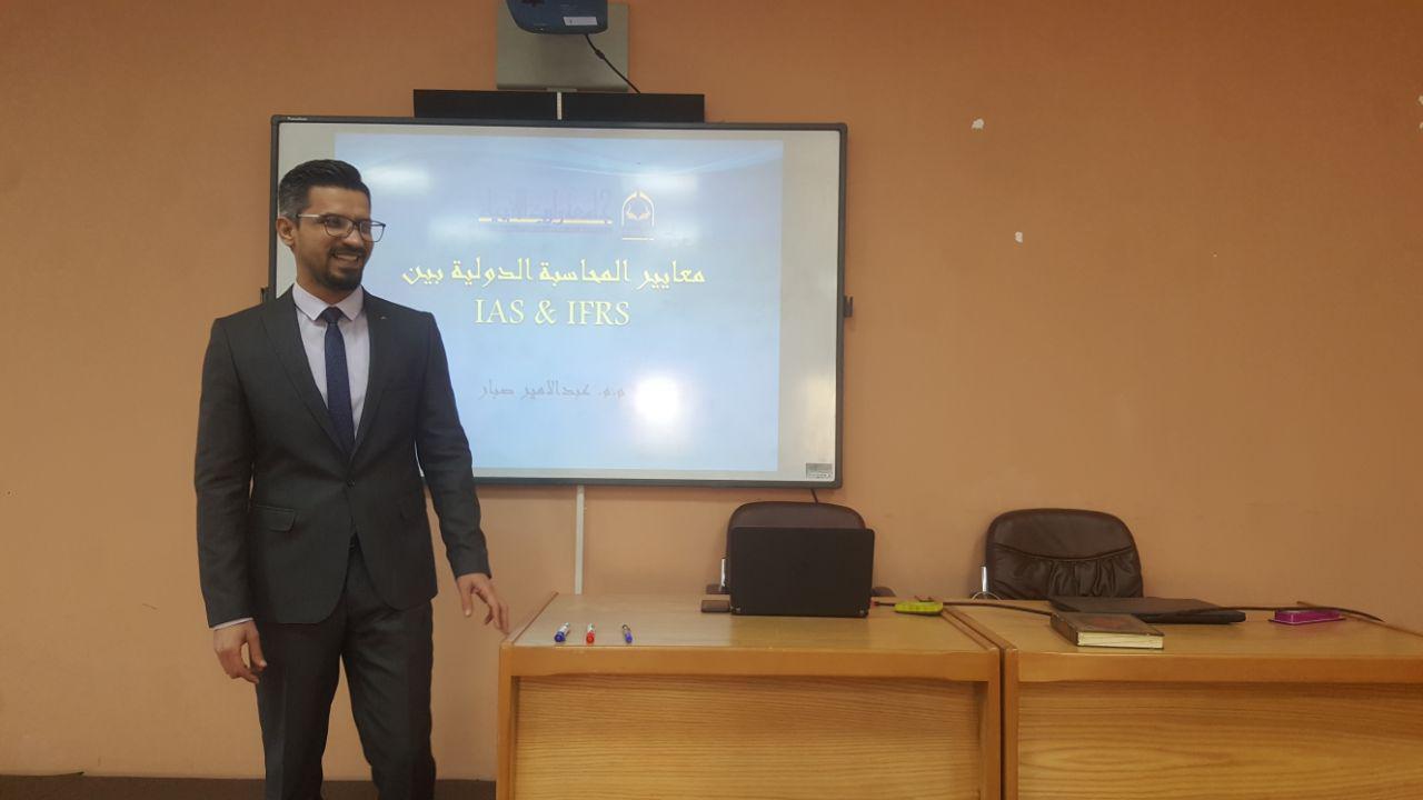 أقام قسم ادارة الاعمال في كلية الادارة والاقتصاد حلقة نقاشية بعنوان (معايير المحاسبة الدولية بين IAS&IFRS) قام بألقائها الاستاذ (م.م عبدالامير صبار) يوم الاثنين المصادف 7\1\2019وقد حضر الجلسة كل من سيادة عميد الكلية أ.د.عامر العطوي و رئيس قسم المحاسبة م.د.فهد الشمري و رئيسة قسم ادارة الاعمال د. نضال المالكي والسادة التدريسيين وقد ركزت الورشة على توضيح مفهوم المعايير  الدولية وطريقة انشائها وكيفية توظيفها لخدمة الجانب التعليمي لطلبة كليتنا