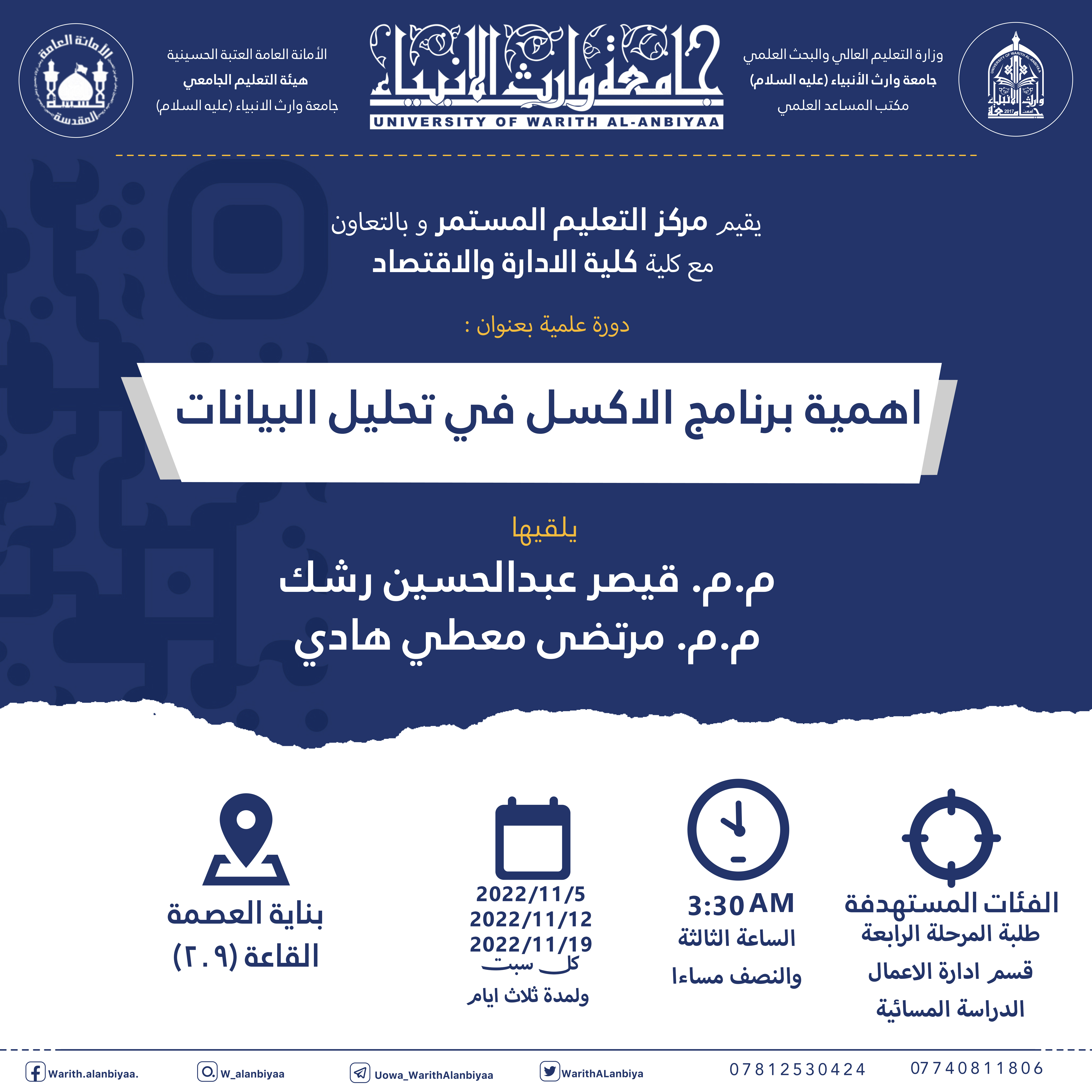 اعلان اقامة دورة بعنوان اهمية برنامج الاكسل في تحليل البيانات
