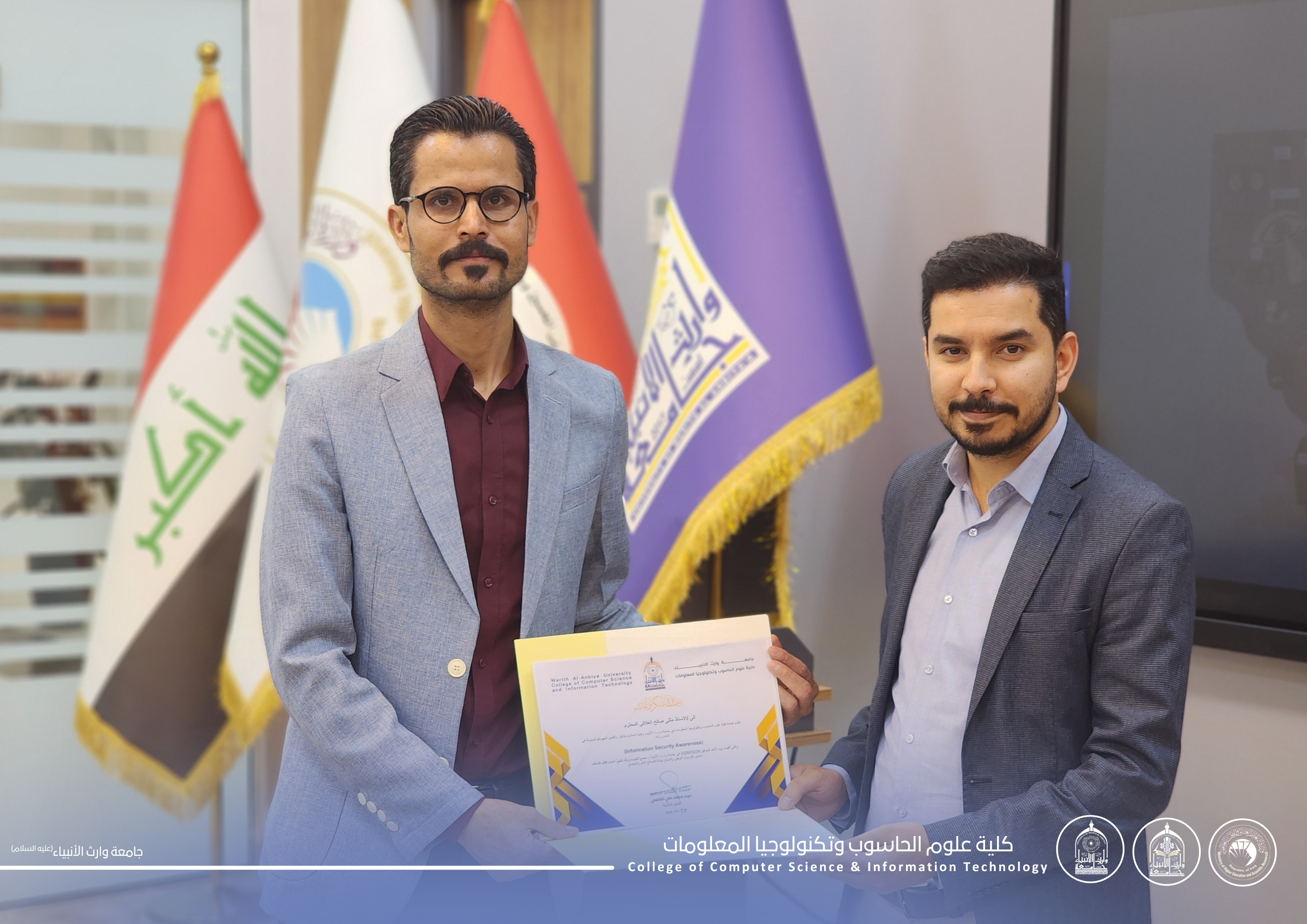 وفي ختام الورشة، كرّم الدكتور علي كريم عبد الرحيم، رئيس قسم الأمن السيبراني، المحاضر تثمينًا لجهوده في تقديم محتوى علمي قيّم يسهم في تطوير مهارات الطلبة ورفع مستوى وعيهم التقني.