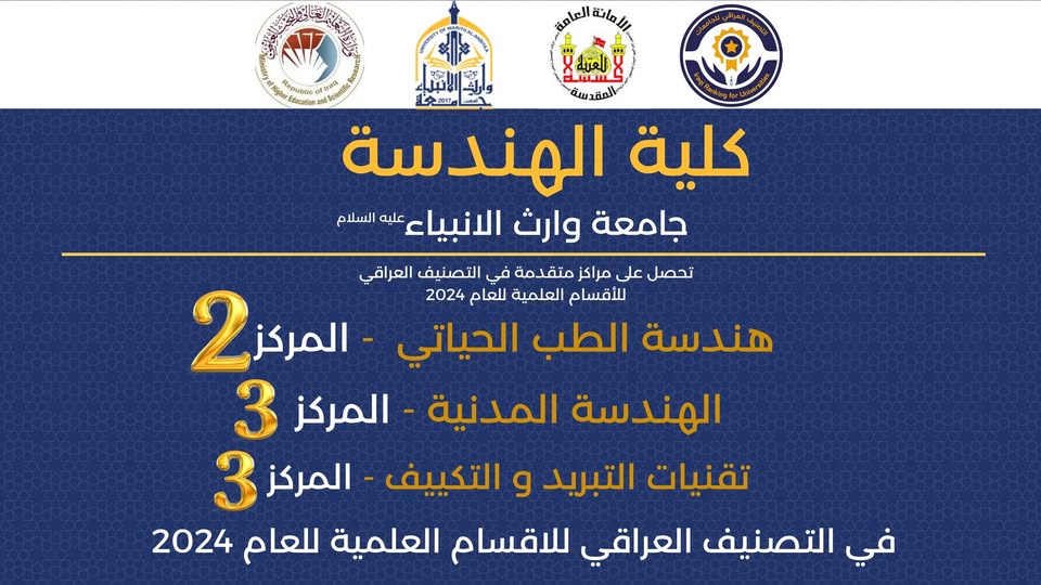 مبارك لكلية الهندسة في جامعة وارث الانبياء ع حصولها على المركز الأول في الامتحانات التقويمية الوزارية على جميع الجامعات الأهلية والذي يُعد دليلًا على الرصانة العلمية والتميّز الأكاديمي الذي تتمتع به الكلية وكوادرها