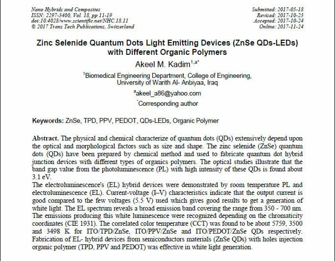 وحسب ما تحدث به الباحث بان البحثيين اختصا في تصميم الاجهزة الباعثة للضوء من مواد نانوية ومركبات عضوية من بوليمرات مختلفة التركيب تسمى ((OLEDs)) والتي تتشكل هندسياً بطريقة كيميائية معينة وتبعث ضوءً ذو ضيائية عالية وبكفاءة ممتازة وبفولتية كهربائية قليلة قد تصل الى (11فولت) واوضح الدكتور عقيل بان اهم التطبيقات لهذا الانجاز العلمي في الحياة العملية هو دخوله في مجال الهندسة الطبية الحيوية حيث يكون عمل هذه الاجهزة ككواشف ملونة بألوان الضوء الباعث منها لكشف الامراض والاورام داخل جسم الكائن الحي وفي العديد من المجالات الهندسية والطبية والابحاث العلمية الاخرى.