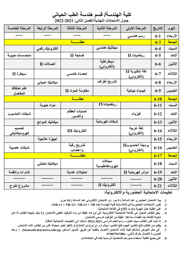 جدول الامتحانات النهائية لقسم هندسة الطب الحياتي للعام الدراسي 2021-2022 الفصل الدراسي الثاني