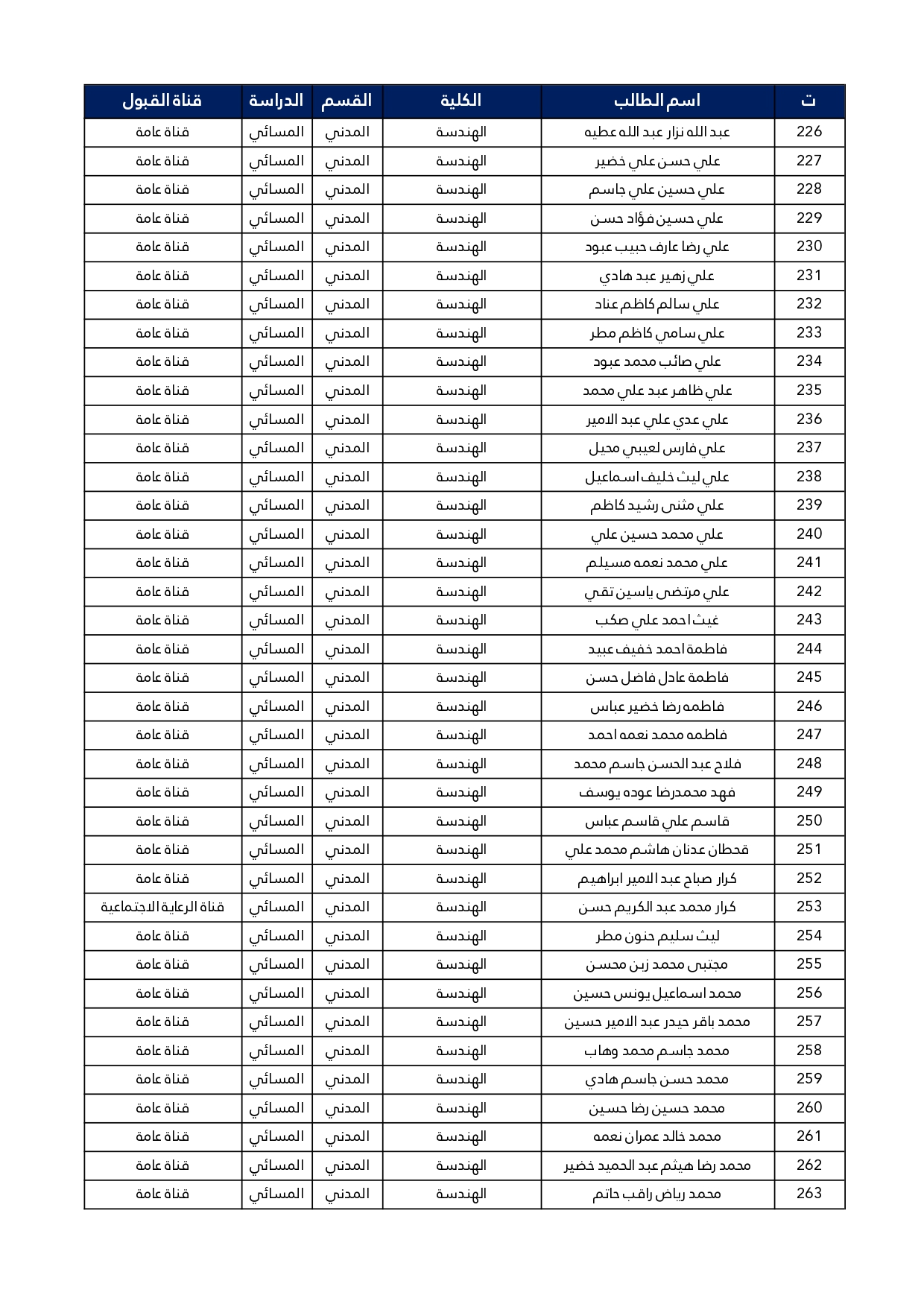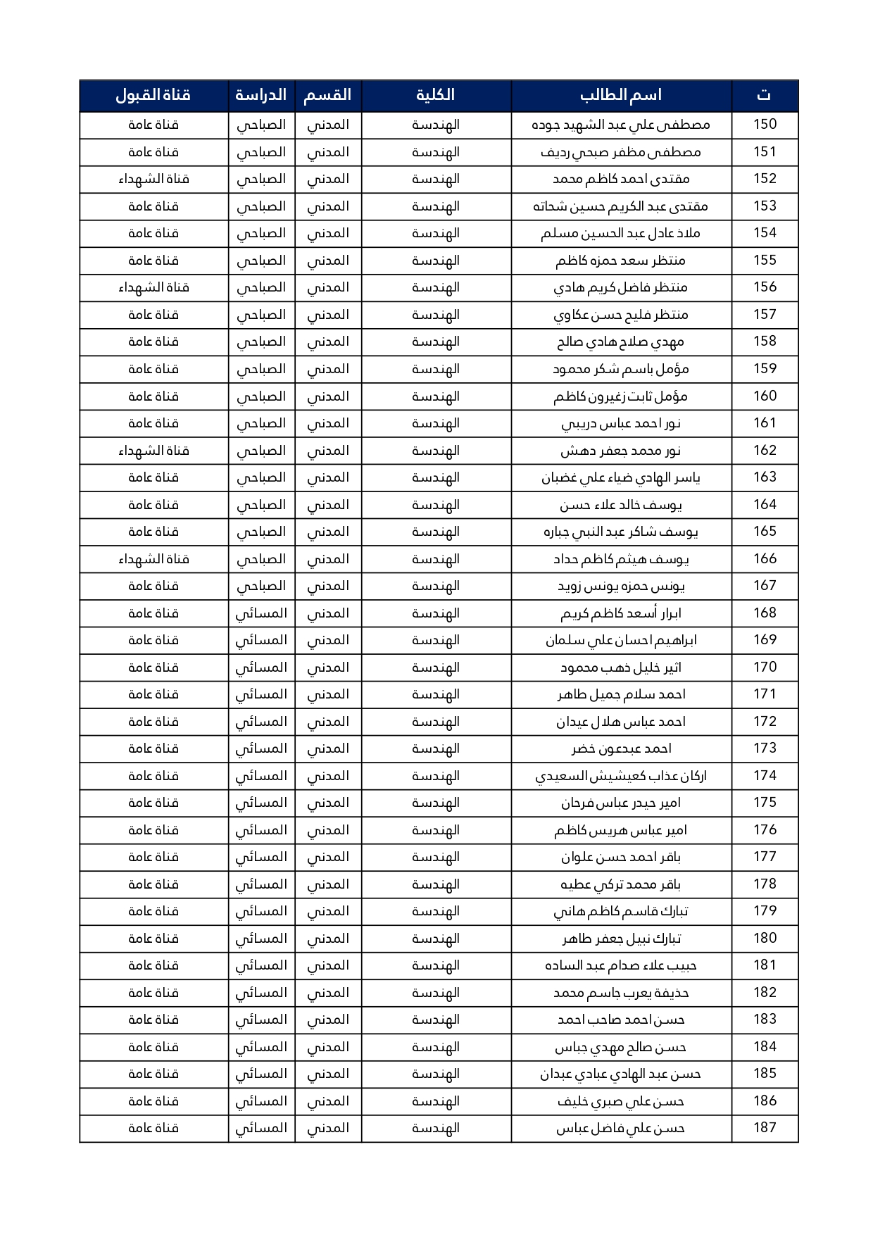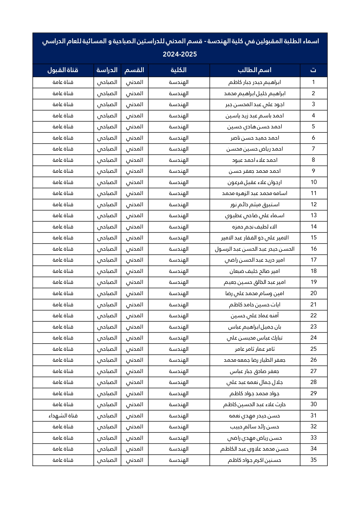 اسماء الطلبة المقبولين في قسم الهندسة المدنية للعام الدراسي 2025/2024 للدراستين الصباحية و المسائية