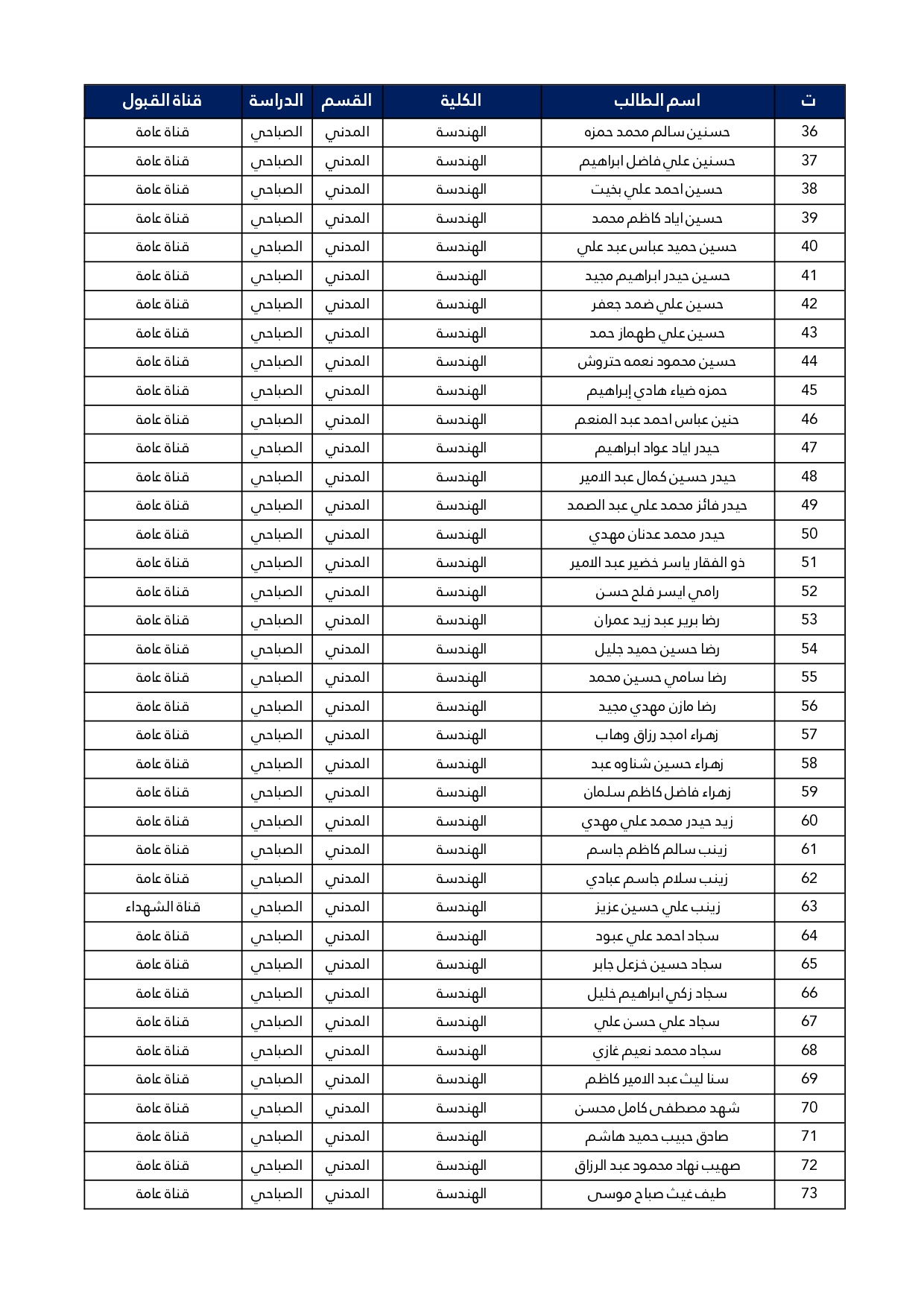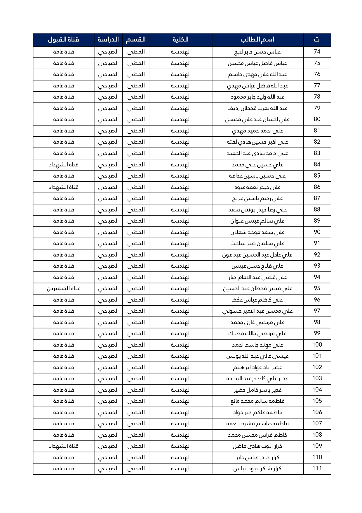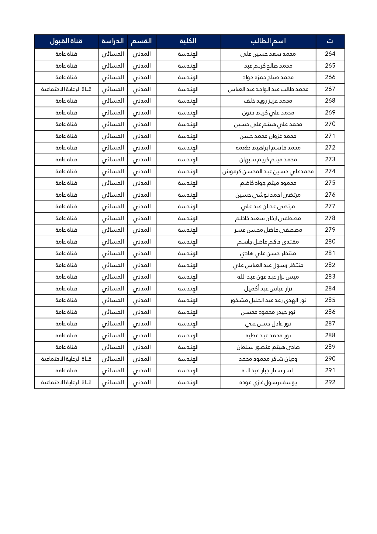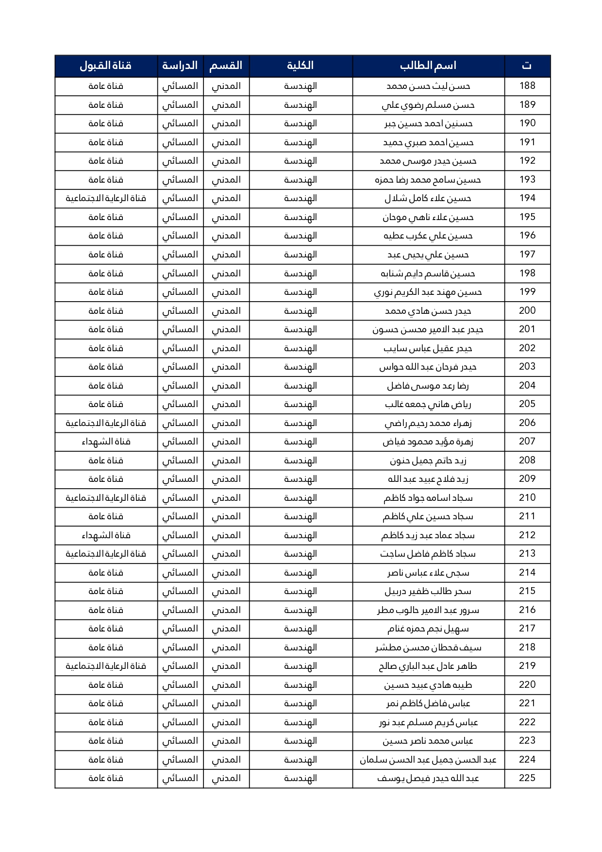 اسماء الطلبة المقبولين في قسم الهندسة المدنية للعام الدراسي 2025/2024 للدراستين الصباحية و المسائية