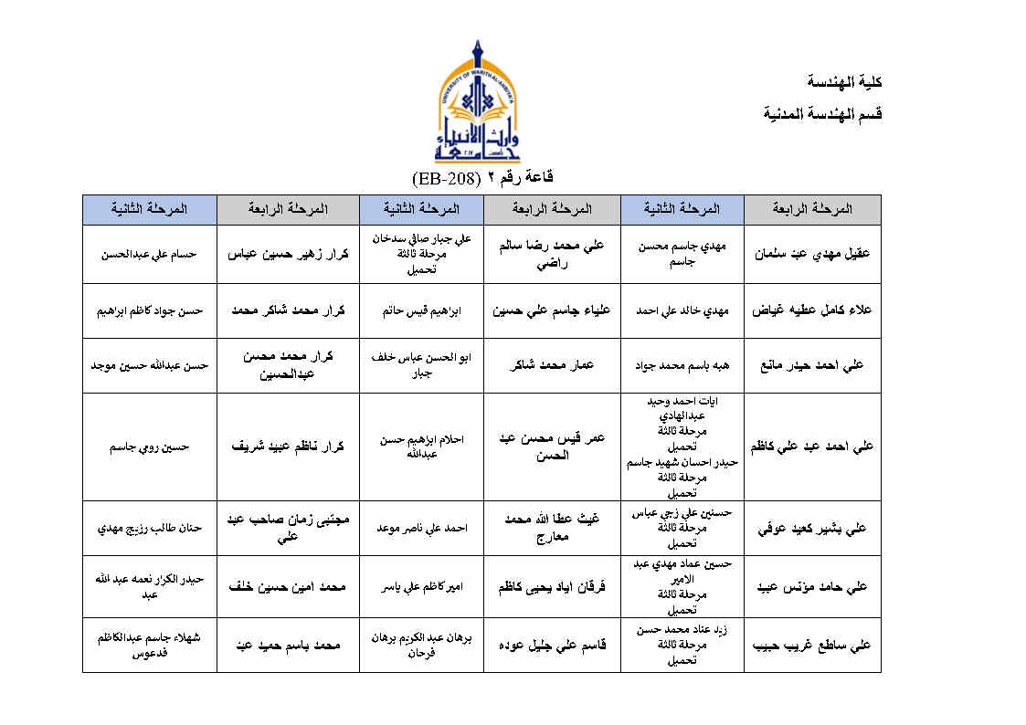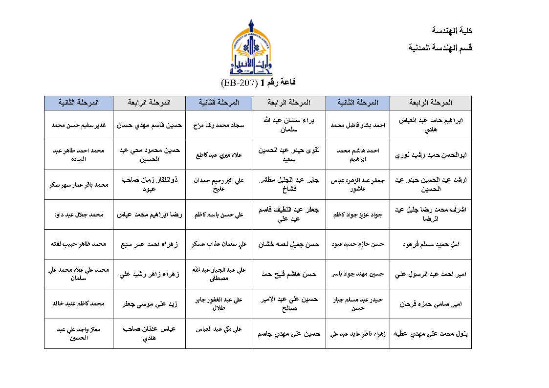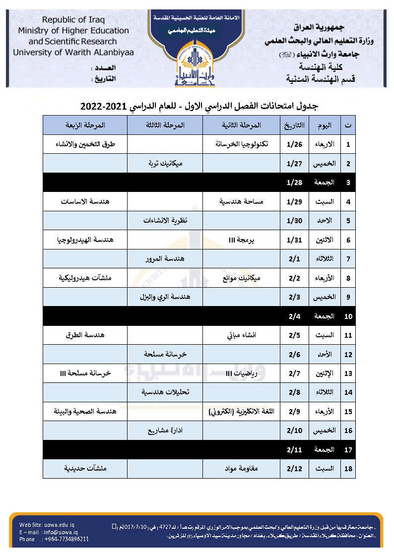 جدول امتحانات النهائية للفصل الاول لقسم الهندسة المدنية مع خارطة توزيع الطلاب في القاعات مع التعليمات