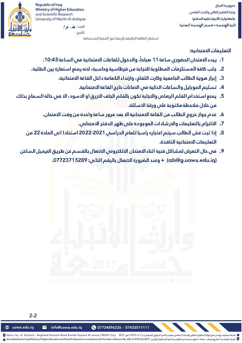 جدول امتحانات الفصل الدراسي الثاﻧﻲ للعام الدراسي 2021 - 2022 لطلبة قسم الهندسة المدنية مع التعليمات الامتحانية