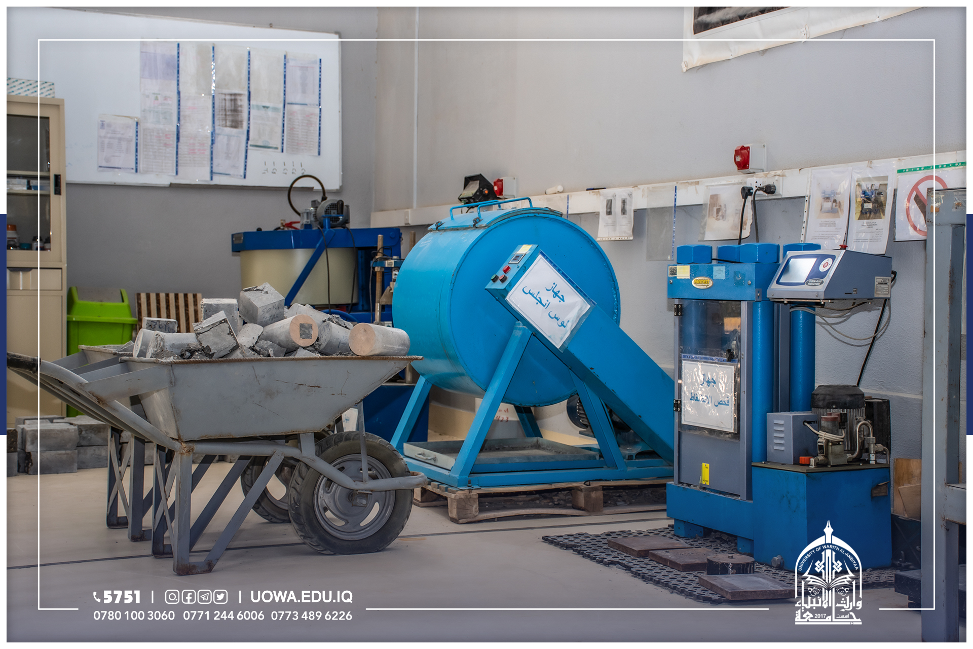 يعنى هذا المختبر بأجراء الفحوصات المختبرية للمواد الانشائية وكذلك الفحوصات المختبرية للإسمنت والمواد الخرسانية والركام (الرمل والحصى) وهذه الفحوصات ضرورية جدا لتمكن الطالب من معرفة كيفية خلط المواد مع بعضها البعض وبنسب معينه ودقيقه ومعرفة المشاكل التي تواجهه في حال لم يتم خلط المواد وفقا للنسب المحددة والظروف القياسية الملائمة التي تؤدي الى نجاح او فشل العينة ومدى مطابقتها للمواصفات الفنية من عدمه بالإضافة الى ذلك تمنح الفحوصات المختبرية دورا مهما يمكن المهندس من معرفة المادة الانشائية الجيدة وتمييزها والتي تؤدي الى زيادة عمر المنشأ