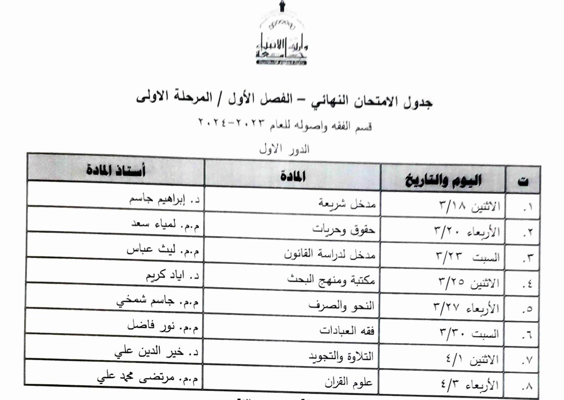 جدول الامتحانات النهائية للفصل الاول من العام الدراسي 2023-2024 قسم الفقه وأصوله - المرحلة الأولى