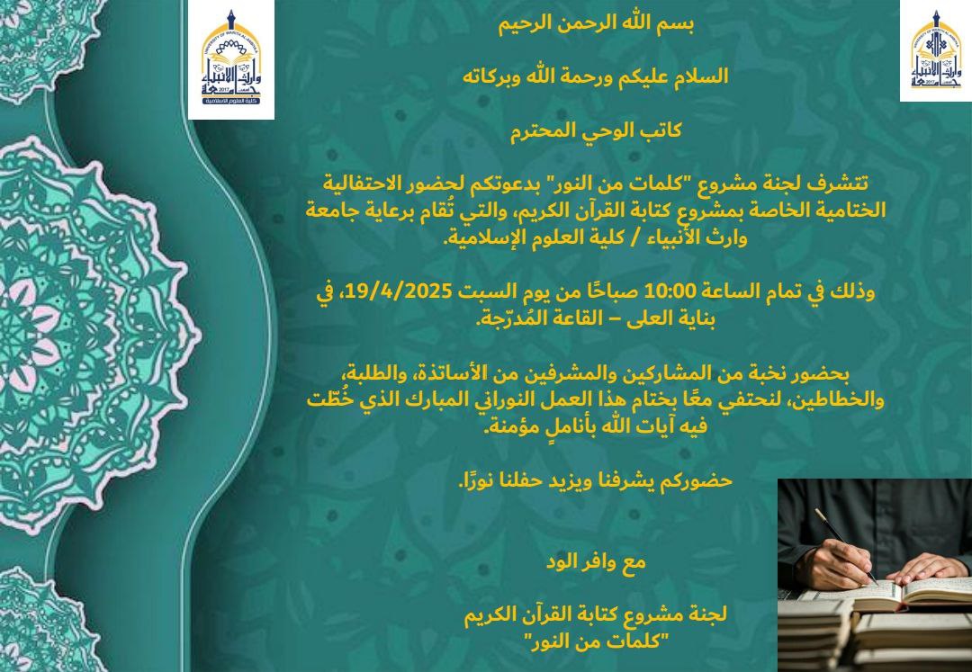 تتشرف لجنة مشروع "كلمات من النور" بدعوتكم لحضور الاحتفالية الختامية الخاصة بمشروع كتابة القرآن الكريم، والتي تُقام برعاية جامعة وارث الأنبياء / كلية العلوم الإسلامية.