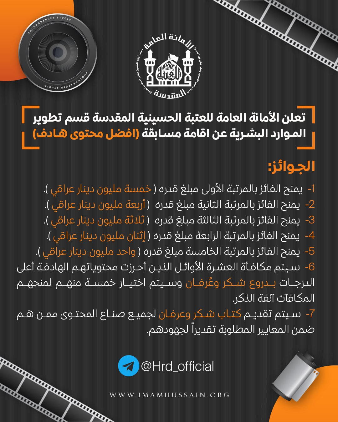 تعلن الأمانة العامة للعتبة الحسينية المقدسة قسم تطوير الموارد البشرية عن اقامة مسابقة (افضل محتوى هادف) وتكون المسابقة وطنية عامة تشمل كافة الناس من صناع المحتوى والمهتمين والهواة للمشاركة في هذه المسابقة.