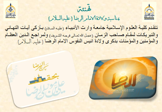 تتقدم كلية العلوم الإسلامية جامعة وارث الأنبياء (عليه السلام) بأزكى آيات التهاني والتبريكات لمقام صاحب الزمان (عجل الله تعالى فرجه الشريف) ولمراجع الدين العظام والمؤمنين والمؤمنات بذكرى ولادة انيس النفوس الامام الرضا ( عليه السلام) .