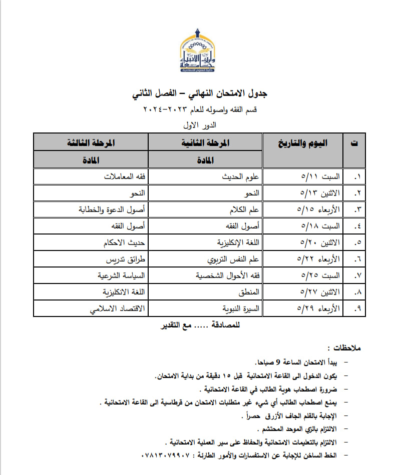 جدول الامتحانات النهائية للفصل الثاني من العام الدراسي 2023-2024 قسم علوم القرآن - المرحلة الثانية - الثالثة