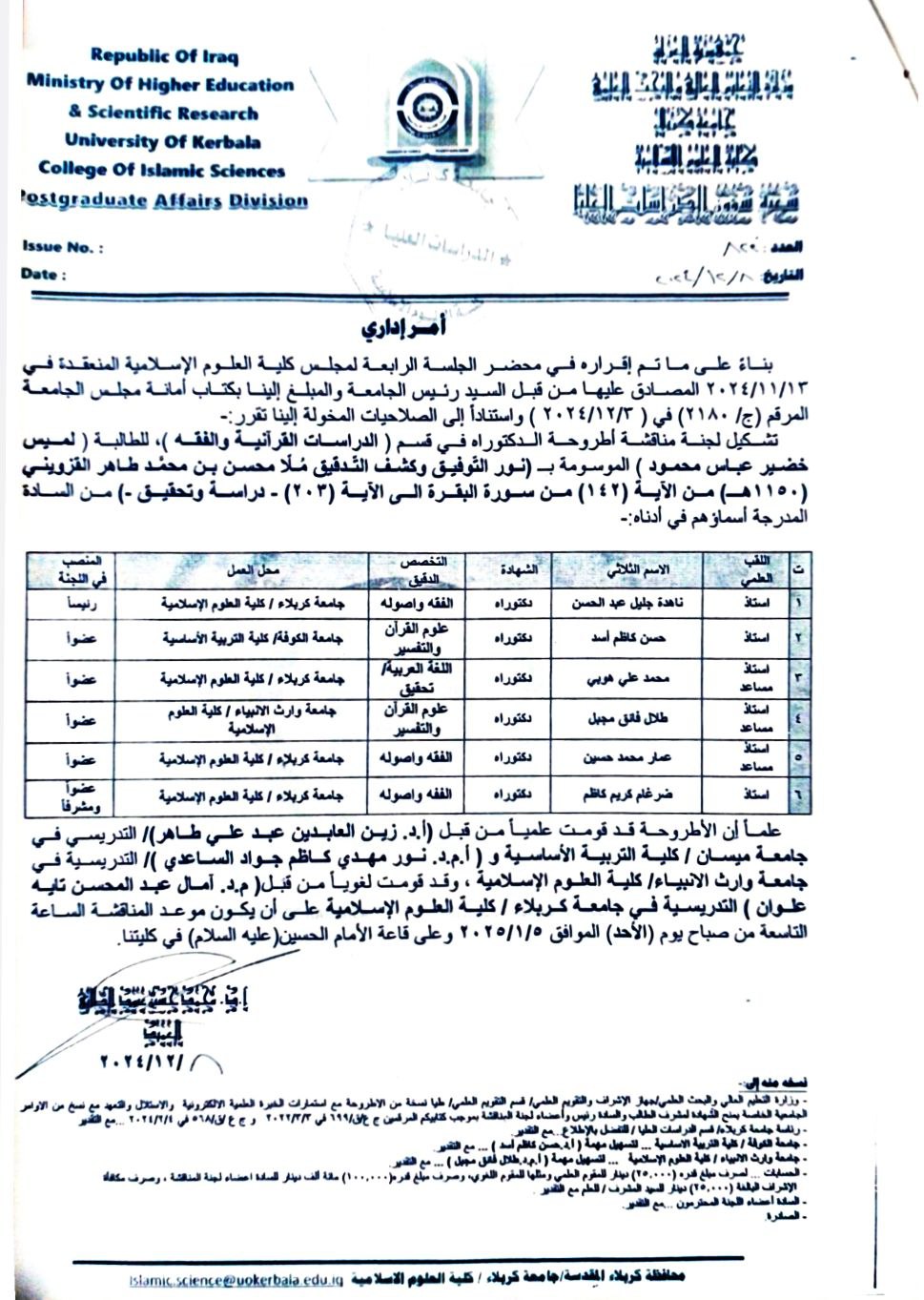 عُقدت جلسة المناقشة يوم الأحد الموافق 5/1/2025 في قاعة الإمام الحسين (عليه السلام) بكلية العلوم الإسلامية في جامعة كربلاء، بحضور نخبة من الأساتذة والمختصين.
