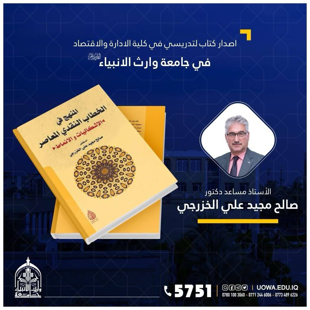 صدر حديثًا عن الأستاذ المساعد الدكتور صالح مجيد علي الخزرجي، التدريسي في جامعة وارث الأنبياء، كتابٌ جديد بعنوان "المنهج في الخطاب النقدي المعاصر: الإشكاليات والأنماط".