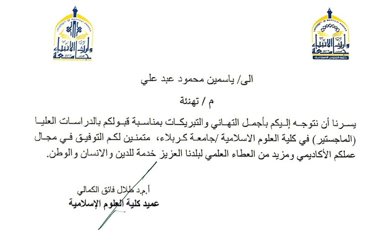 تتقدم كلية العلوم الإسلامية في جامعة وارث الأنبياء بأحر التهاني والتبريكات لخرّيجيها المتميزين ياسمين محمود وقحطان عامر بمناسبة قبولهما في الدراسات العليا الماجستير بجامعة كربلاء.
