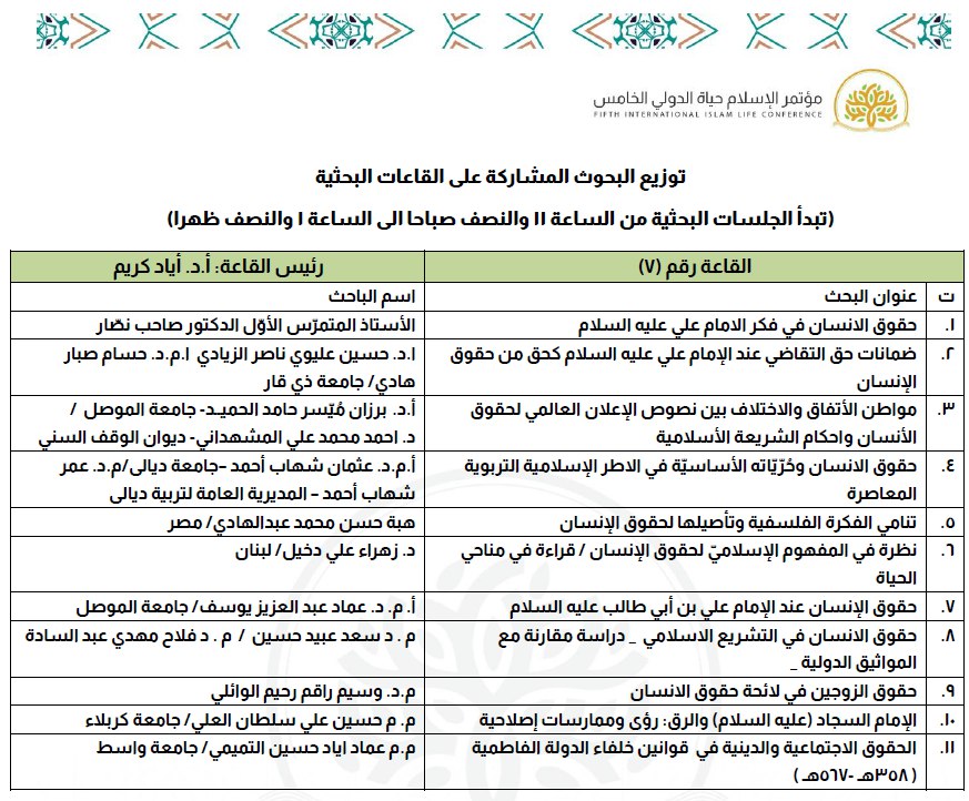 أقيم المؤتمر العلمي الخامس "الإسلام حياة" تحت شعار "حقوق الإنسان والتحديات المعاصرة" بمشاركة واسعة من جامعات العراق والدول العربية والأجنبية. وقالت الدكتورة نور مهدي الساعدي إن المؤتمر شهد تقديم 85 بحثًا من مختلف جامعات العراق، من السليمانية إلى البصرة، وهي سابقة تنفرد بها مؤتمرات كلية العلوم الإسلامية في جامعة وارث الأنبياء.