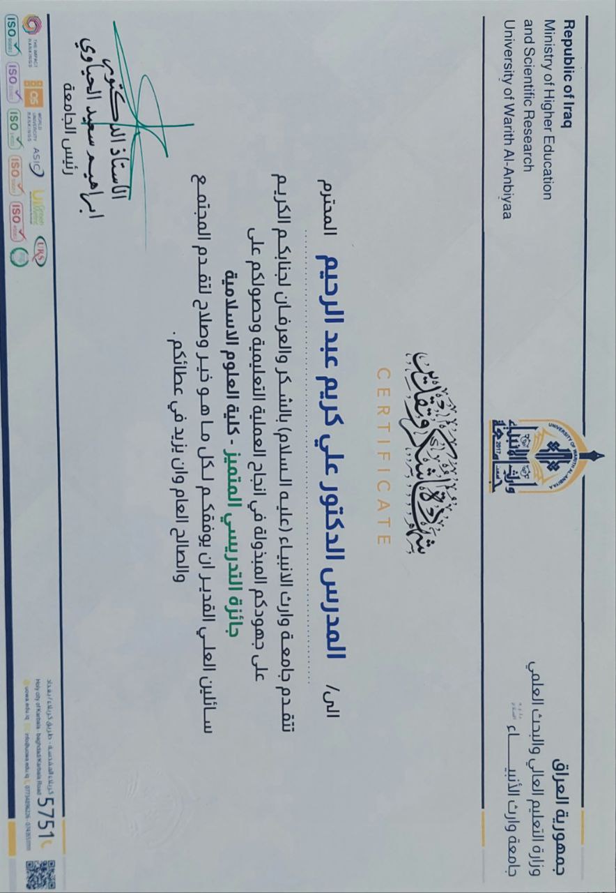 حصول المدرس الدكتور علي كريم على جائزة التدريسي المتميز