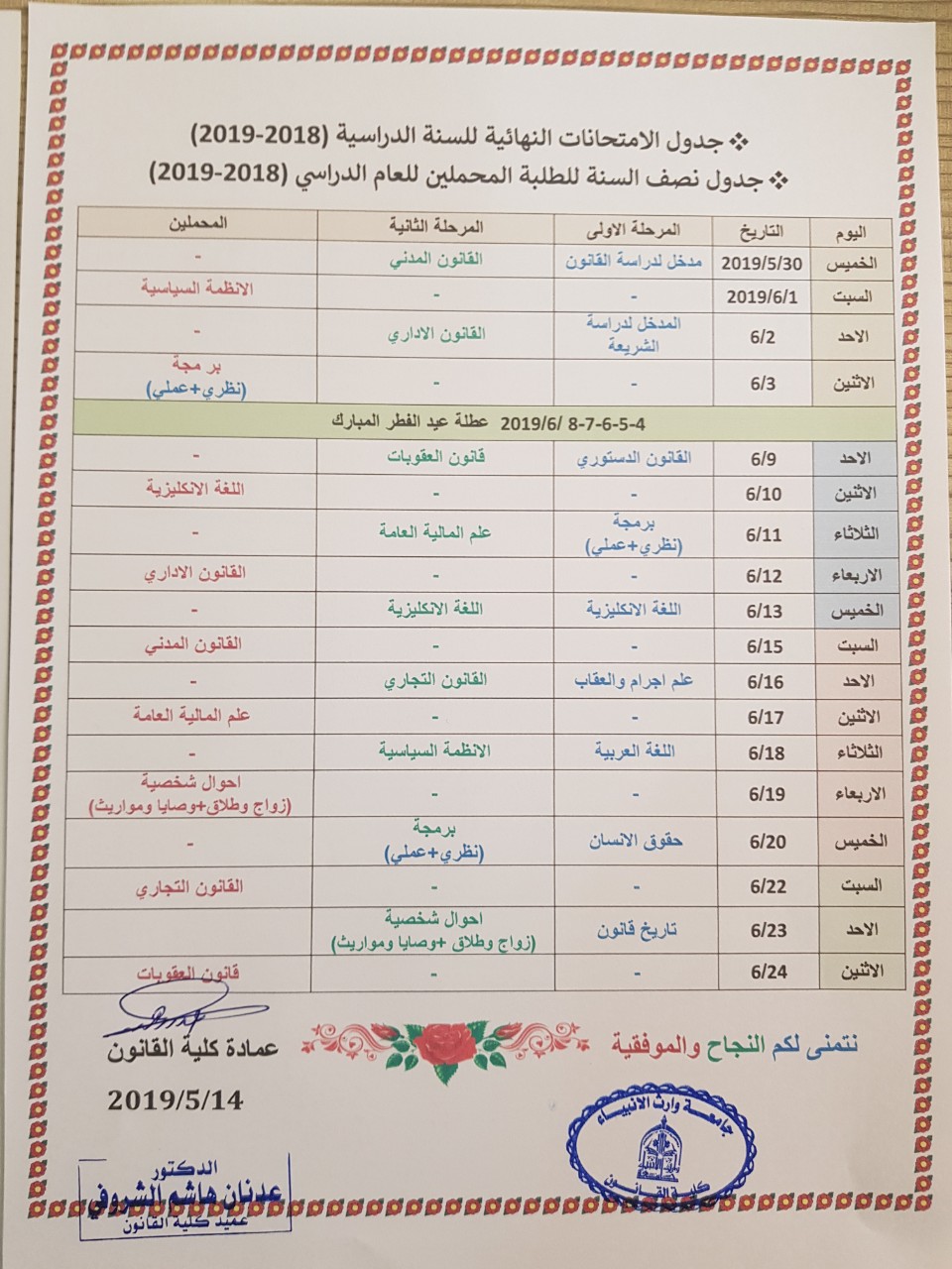 جدول الامتحانات النهائية+جدول المحملين
