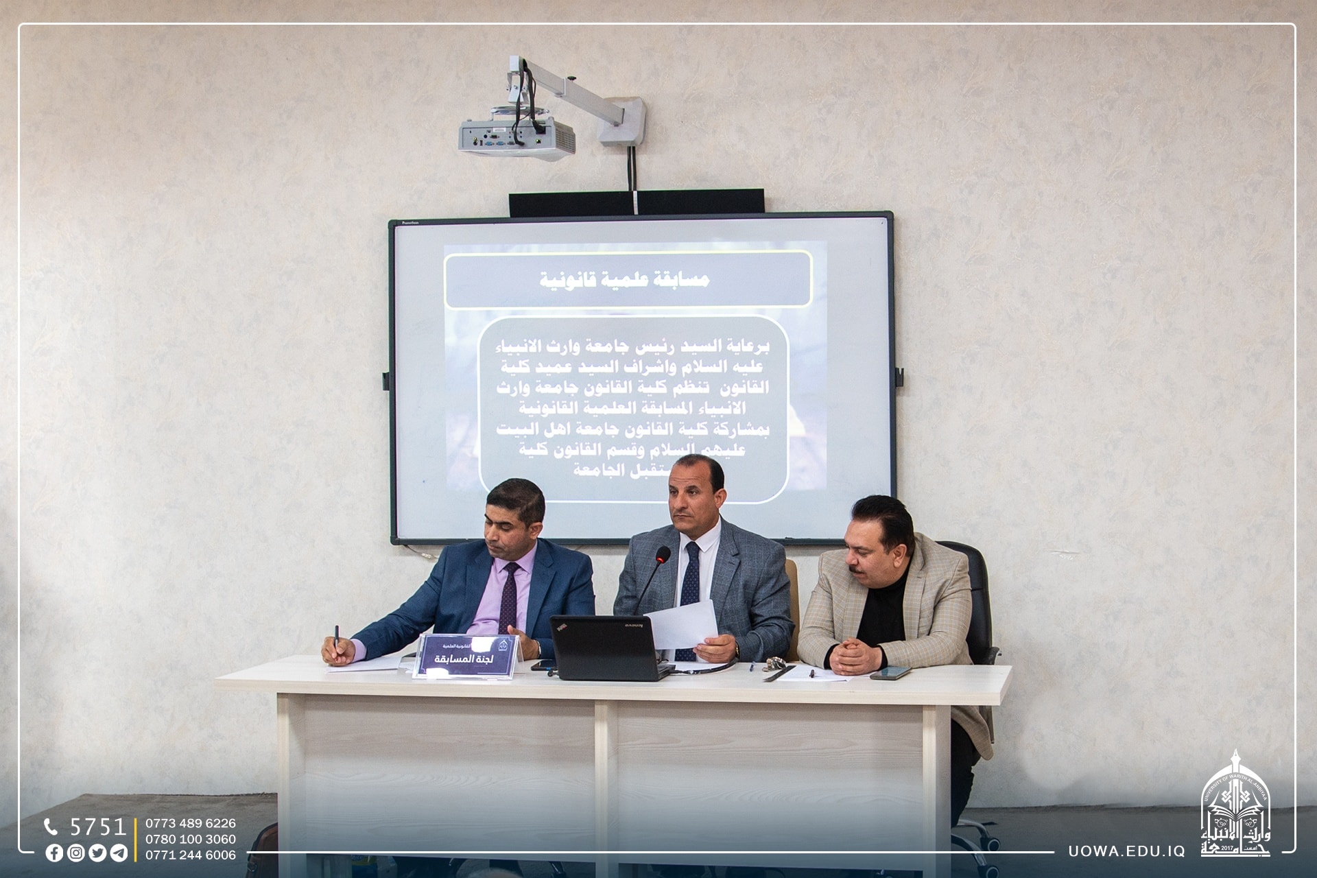 حيث حكم المسابقة عدد من اساتذة القانون في جامعة كربلاء، وتناولت المسابقة اسئلة قانونية من شانها رفع المستوى العلمي للطلبة واثراء الجانب القانوني لديهم حيث احرز فرق كلية القانون في جامعة وارث الانبياء(عليه السلام) الفوز في المسابقة.