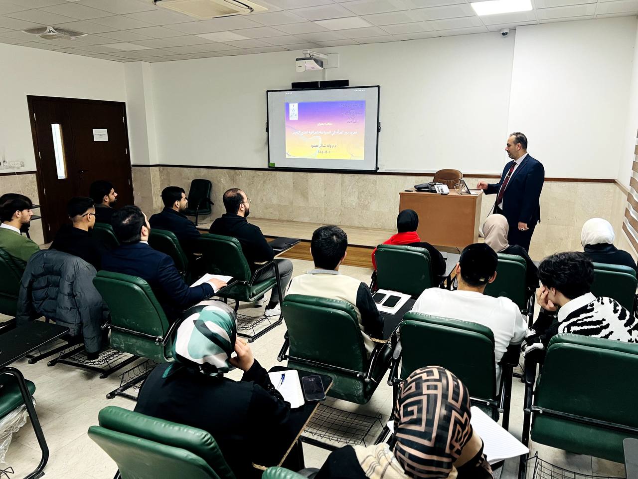 اقامت كلية الاعلام في جامعة وارث الانبياء عليه السلام، ندوة علمية حملت عنوان "تعزيز دور المرأة في السياسة العراقية لصنع التغيير" قدمها التدريسي في الكلية الاستاذ (ولاء شاكر محمود)، بين من خلالها ان المشاركة السياسية النسوية يعنى بها قدرة النساء على الانخراط في العملية السياسية بمختلف مستوياتها، سواء في الانتخابات، أو الانتساب للأحزاب، أو المناصب التشريعية والتنفيذية، أو صياغة السياسات العامة، أو التأثير في اتجاهات الرأي العام، وهي تمثل امتداداً لعملية تمكين أوسع، تشمل التمكين الاقتصادي والاجتماعي والثقافي.