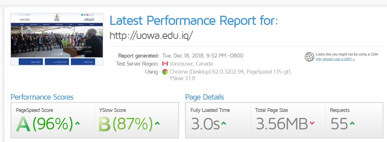 بعد فحص سرعة موقع جامعة وارث الانبياء التابعة للعتبة الحسينية المقدسة ومقارنته بابرز مواقع الجامعات الحكومية والاهلية كانت النتيجة عالية مقارنة بالمواقع البقية ،حيث حصل موقع الجامعة على نتيجة 96% بينما اعلى موقع في الجامعات الحكومية والأهلية هو 92% ، وأعتمد موقع الفحص ( gtmetrix.com ) العالمي على معايير شركة كوكل وشركة ياهو الخاصة بقياس سرعة تحميل المواقع الالكترونية.