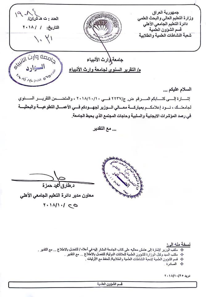 بارك السيد وزير التعليم العالي والبحث العلمي وعن لسان معاون مدير دائرة التعليم الجامعي الأهلي جهود #جامعة_وارث_الأنبياء_التابعة_للعتبة_الحسينية_المقدسة في الأعمال التطوعية والبحثية في رصد المؤشرات الإيجابية والسلبية وحاجة المجتمع الذي يحيط بالجامعة ، حيث ويذكر أن الجامعة لها عدد من النشاطات التطوعية والخدمية للمجتمع في محافظة كربلاء المقدسة