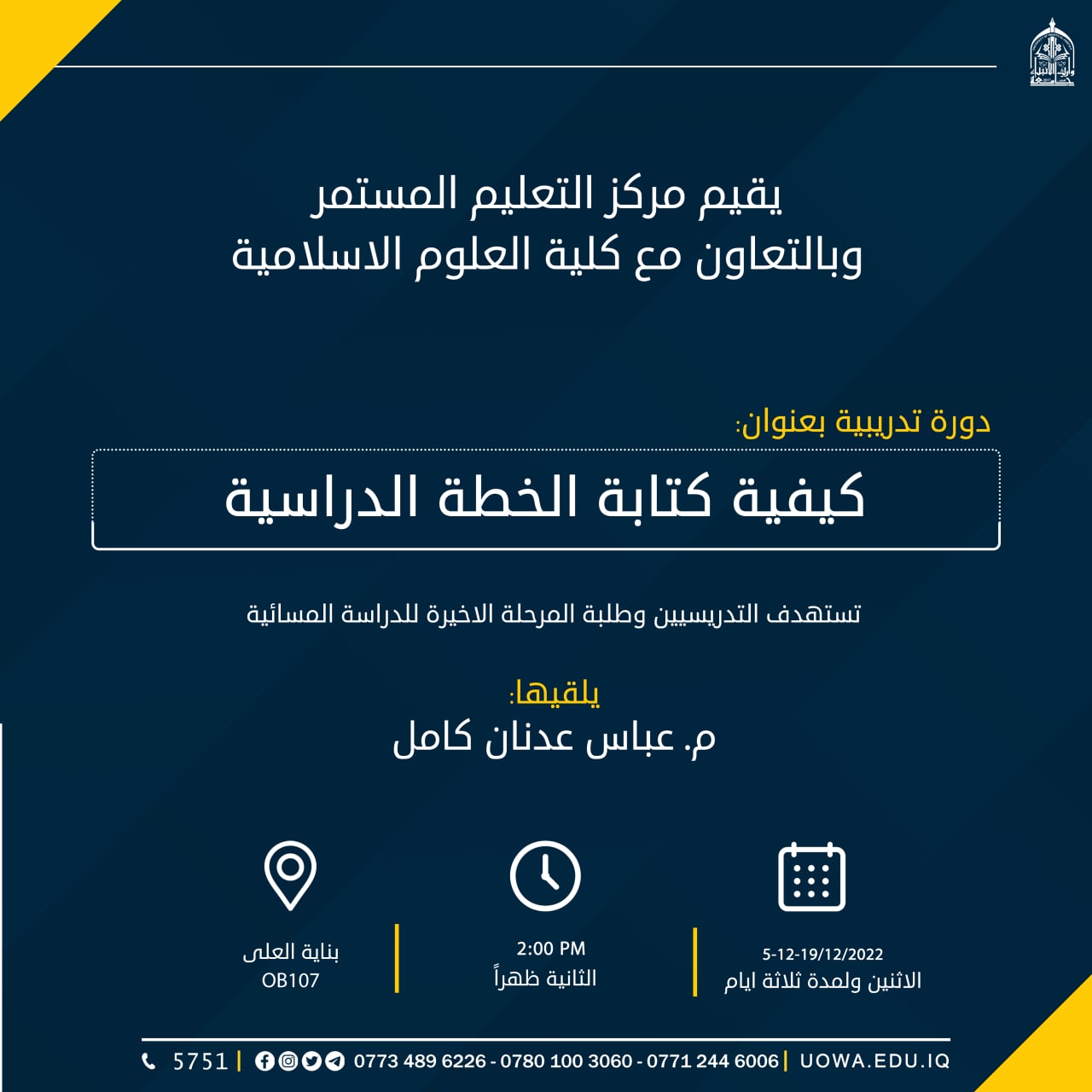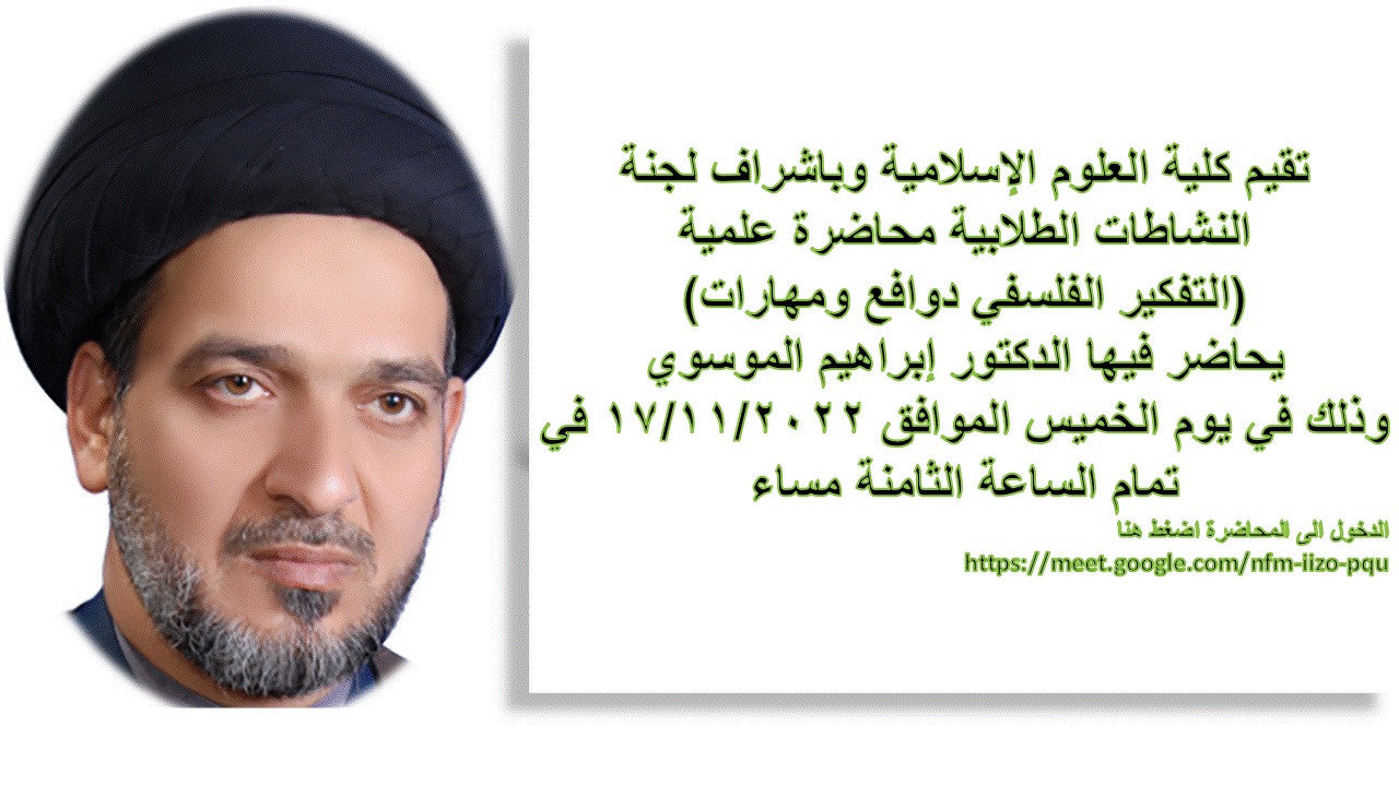 تقيم كلية العلوم الاسلامية حفلها السنوي بذكرى يوم اللغة العربية العالمي في يوم الاثنين الموافق ۱۹ / ۱۲ / ۲۰۲۲ في تمام الساعة الثانية عشرة والنصف (۱۲:۳۰) على القاعة المدرجة في كلية القانون والدعوة عامة للجميع