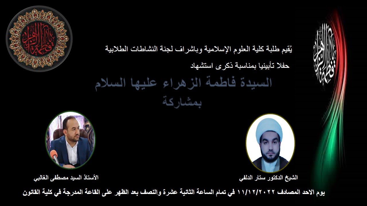 برعاية السيد عميد كلية العلوم الاسلامية الاستاذ المساعد الدكتور طلال فائق الكمالي أقامت لجنة النشاطات الطلابية حفلاً تأبينياً بذكرى استشهاد بنت خير المرسلين الصديقة الطاهرة السيدة فاطمة الزهراء (عليها السلام) حضر المجلس عميد الكلية ورؤساء الأقسام العلمية والتدريسيين والطلبة في يوم الأحد الموافق ١١/١٢/٢٠٢٢حيث ارتقى المنبر سماحة الشيخ الدكتور ستار الدلفي مستذكراً المواقف والأدوار التي قامت بها الزهراء (عليها السلام) في عهد النبوة والإمامة وكيف رسمت لنا ملامح الدفاع عن الإمامة كمنصب إلهي يعتبر استمرارا لمنصب النبوة .ثم موشحات دينية في رثاء السيدة فاطمة الزهراء عليها السلام ألقاها المدرس المساعد مصطفى الغالبي مع لمسات طلابية مرافقة لها علماً ان الحفل التأبيني ضمن برامج كلية العلوم الاسلامية التي تهدف لإحياء ذكرى أهل البيت (عليهم السلام) ولبيان الدور الذي لعبه المعصومين في بناء مجتمع إسلامي متكامل.