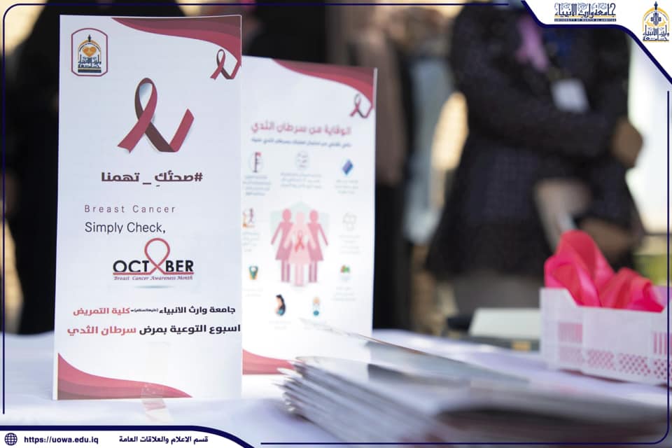 بمناسبة الشهر العالمي للتوعية بسرطان الثديوبرعاية السيد رئيس الجامعة الاستاذ الدكتور طالب حسن موسى وبحضور السيد عميد كلية التمريض أطلقت الكلية حملة(#صحتُكِ_تهمنا)التوعوية بمخاطر هذا المرض وقالت منفذة الحملة المدرس زهراء الثابت :بالتعاون مع اساتذة جامعتي وارث الانبياء والزهراء(عليهم السلام) و انطلاقا من حرصنا على اهمية العنصر النسوي في المجتمع بصورة عامة و العنصر النسوي الموجود في الحرم الجامعي بصورة خاصة فإن الحملة تأتي ضمن جهود الكلية للتأكيد على الاهتمام بطالباتها العزيزات واهمية المعرفة العلمية و العملية بهذا المرض.واضافت الثابت : أن الحملة تتركز على التوعية بهذا المرض وكيفية الوقاية والعلاج واهمية الكشف المبكر عنه ،وتتضمن الحملة اقامة ندوات علمية في الجامعة واقامة جولات تعريفية ايضا بأشراف اساتذة متخصصين اضافة الى توزيع بروشرات توعوية داخل الحرم الجامعي.