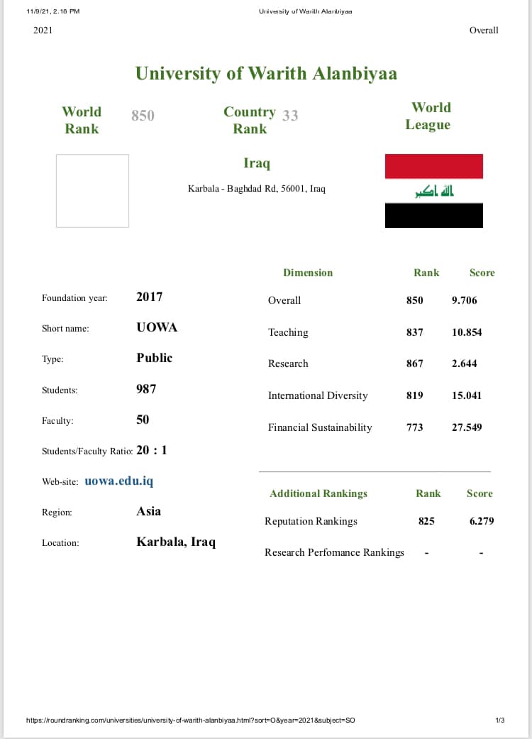 تصنيف عالمي جديد تحرزه جامعة وارث الانبياء(عليه السلام)