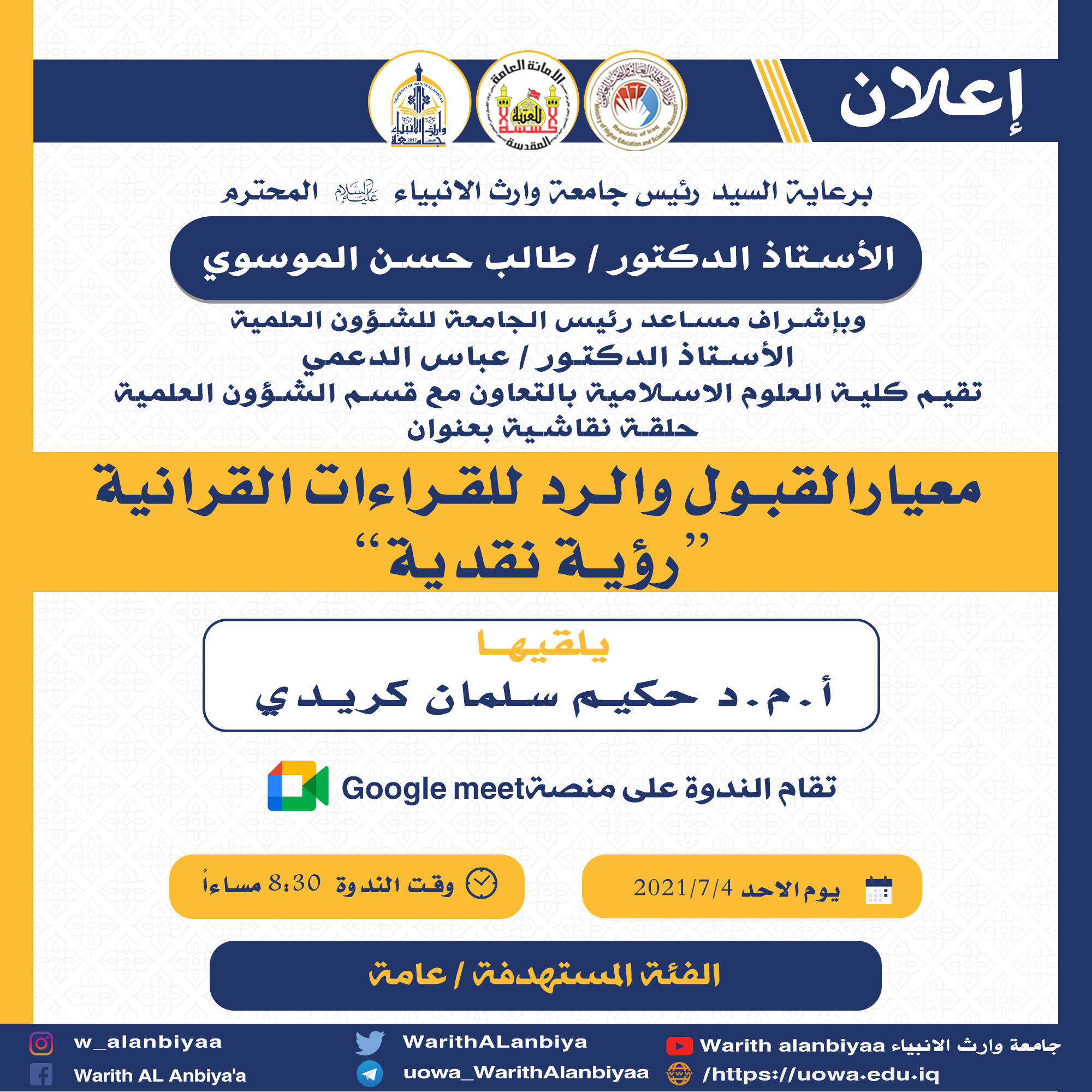 يحاضر في الدورة (م.د. خير الله مهدي) وبادراة (م.م احمد حميد عباس الشكري) على مدى ثلاث ايام (الاثنين ، الاربعاء و السبت) الموافق 2021/7/10،7،5 في تمام الساعة التاسعة مساءاً على منصة التعليم الالكتروني التابعة لجامعة وارث الانبياء (عليه السلام) / كورس التعليم المستمر او من خلال الدخول على الرابط ادناه: (https://meet.google.com/oki-gozn-hoq)