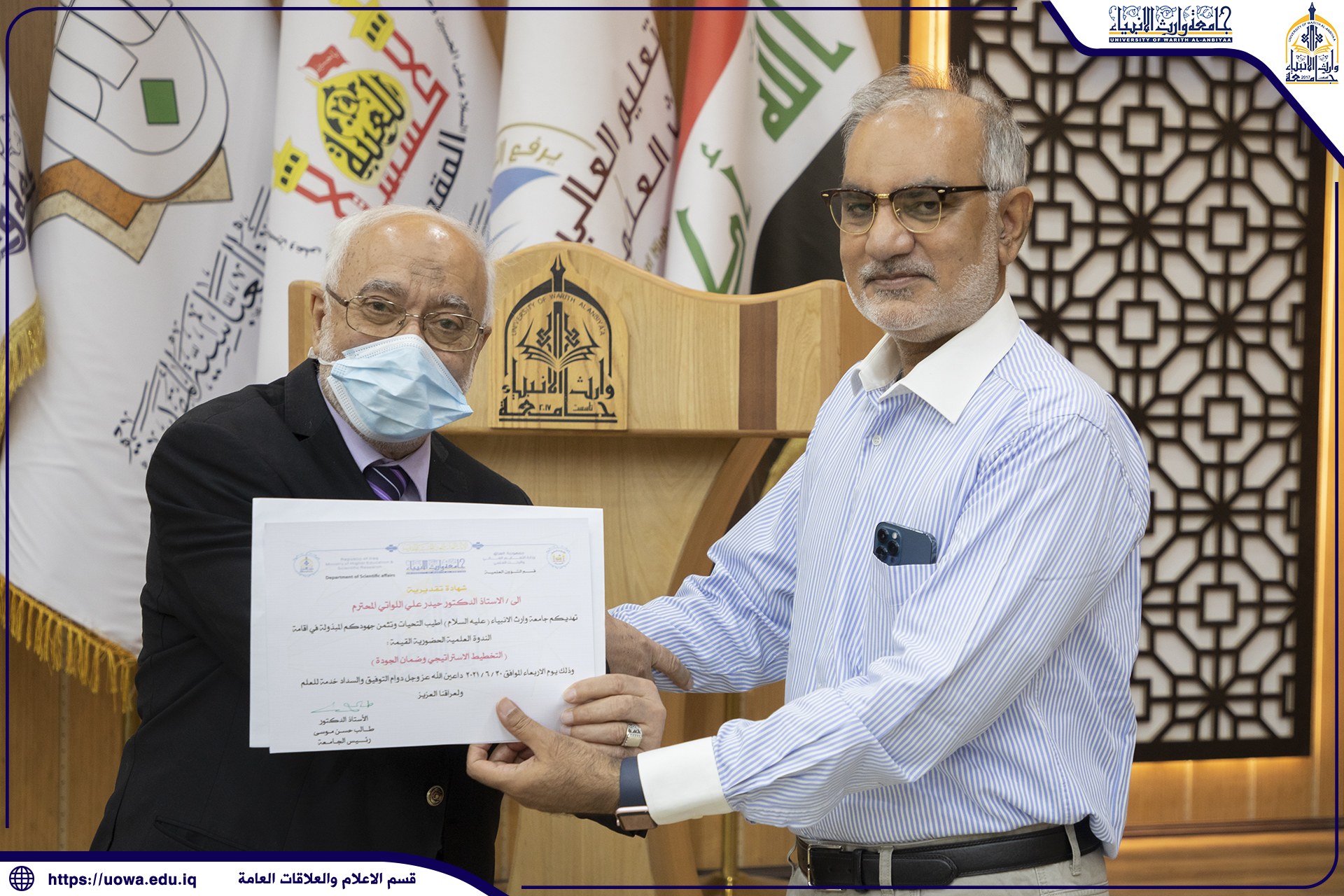 ( شهادة مشاركة التعليم المدمج وطرق تطبيقه على منصة التعليم الالكتروني في جامعة وارث الانبياء ) + ( الامر الجامعي ) + ( شهادة تقديرية للاستاذ المحاضر )