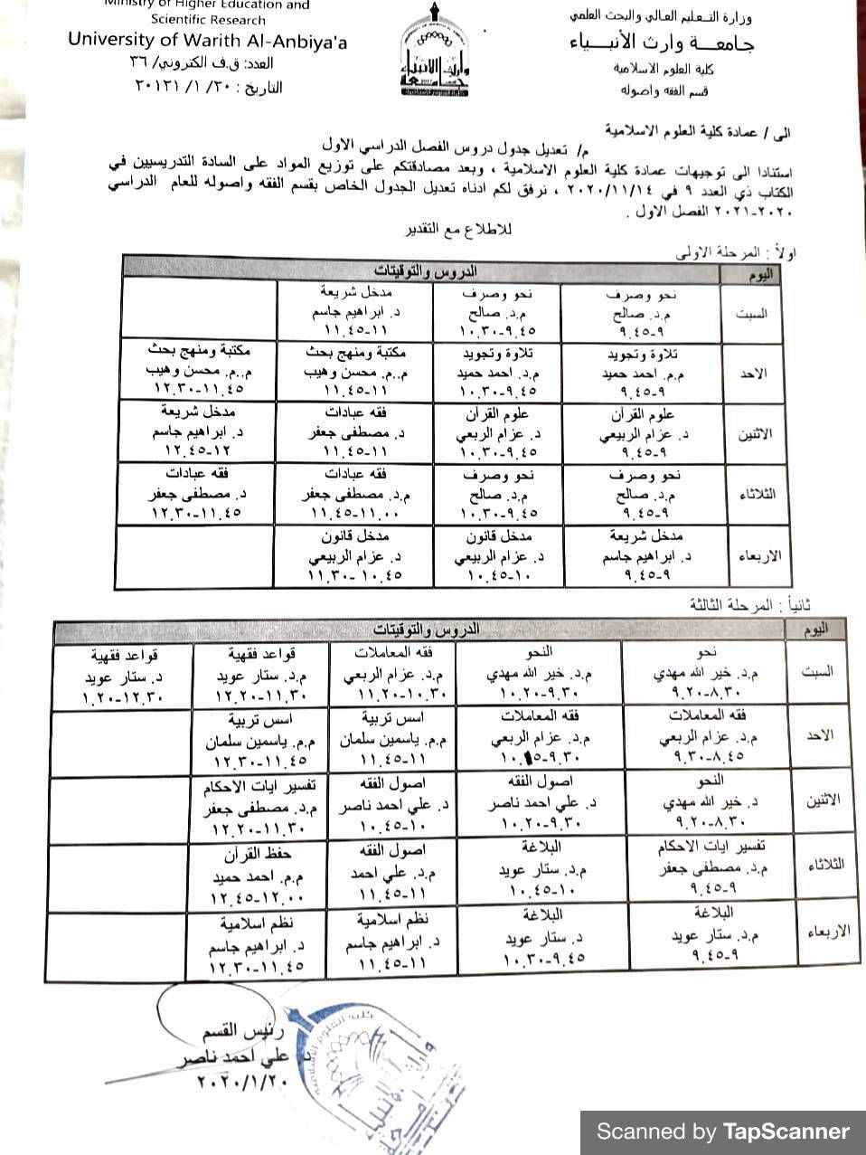 جدول الدروس اليومي لقسم الفقه واصوله