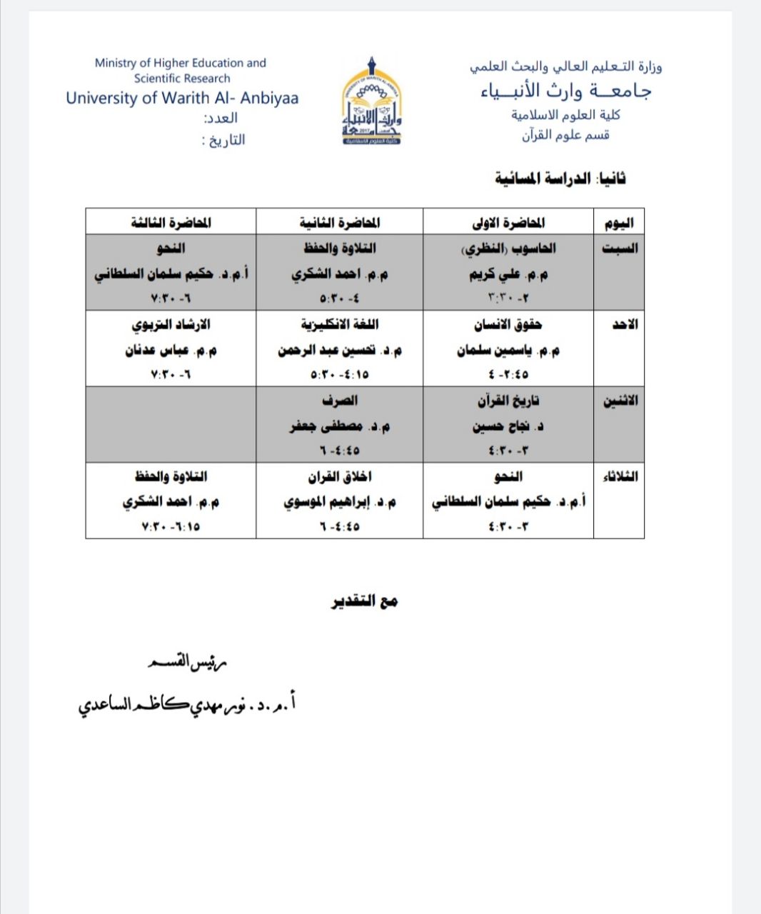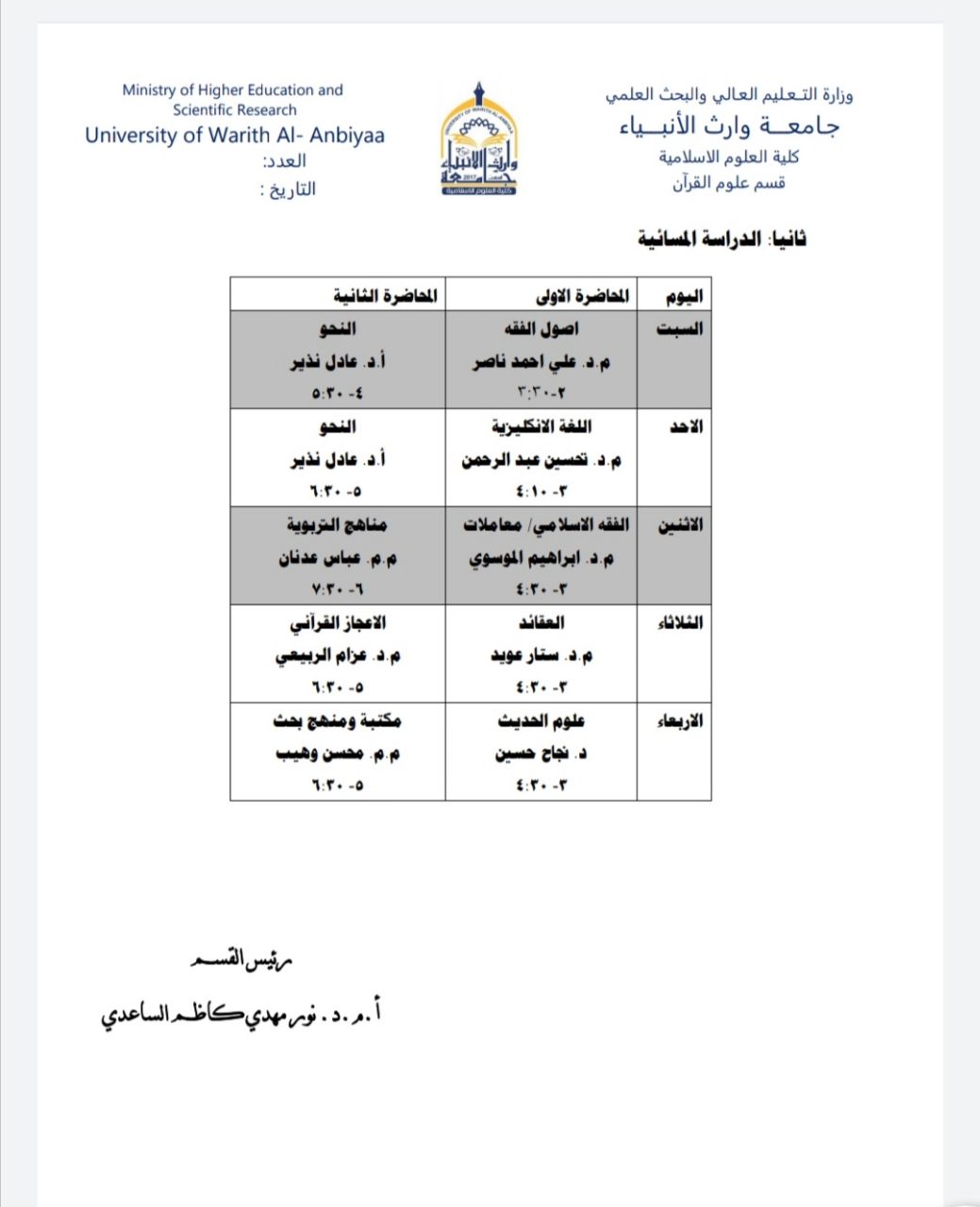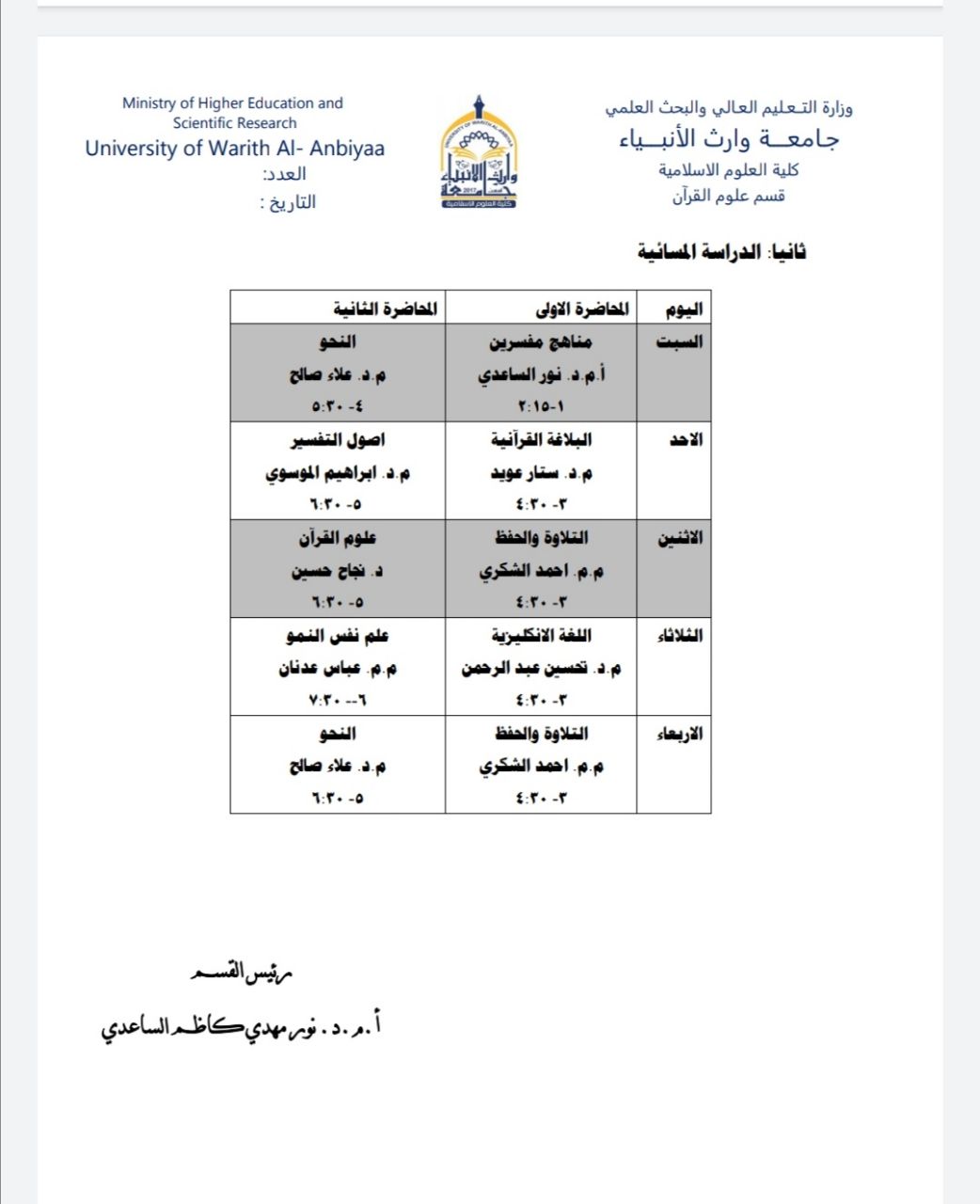 جدول الدروس اليومي للمرحلة الثانية / الدراسة الصباحية والمسائية / قسم علوم القرآن