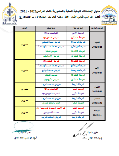 تمت مصادقة عمادة كلية التمريض على جدول الامتحانات العملية النهائية للمراحل ( الثانية و الثالثة و الرابعة ) للفصل الدراسي الثاني للعام الدراسي 2021/2022