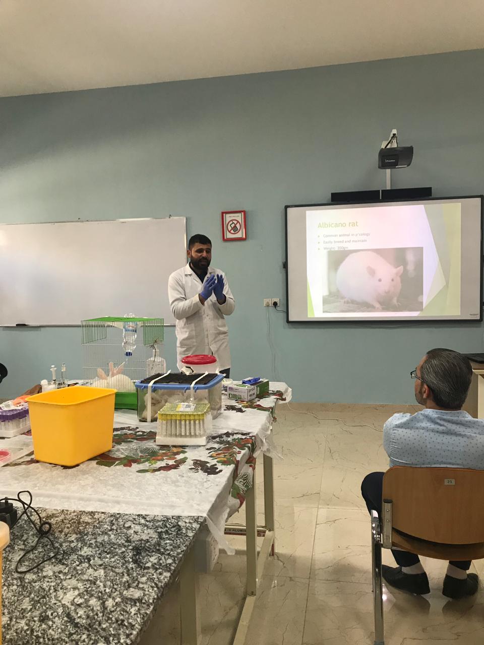 وتخللت الورشة كيفية التعامل مع الحيوانات المختبرية من حيث التغذية والحقن تحت الجلد والتجربة على الحيوانات وحساب الجرعه النصف قاتله LD 50 وطرق امساك الحيوانات وهذه الورشة تستهدف الطلاب لتعليمهم  التجربة والاختبار على الحيوانات المختبرية وطلاب البحوث وطلبة الدراسات العليا.