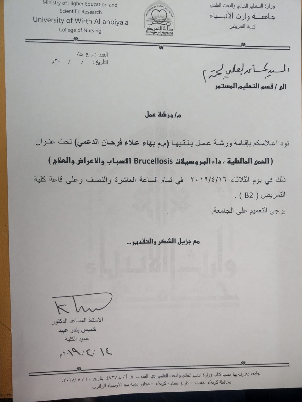 تعلن كلية التمريض /جامعة وارث الانبياء عن اقامة ورشة عمل تحت عنوان (الحمى المالطية، داء البروسيلاتBrucellosis الاسباب والاعراض والعلاج) ،