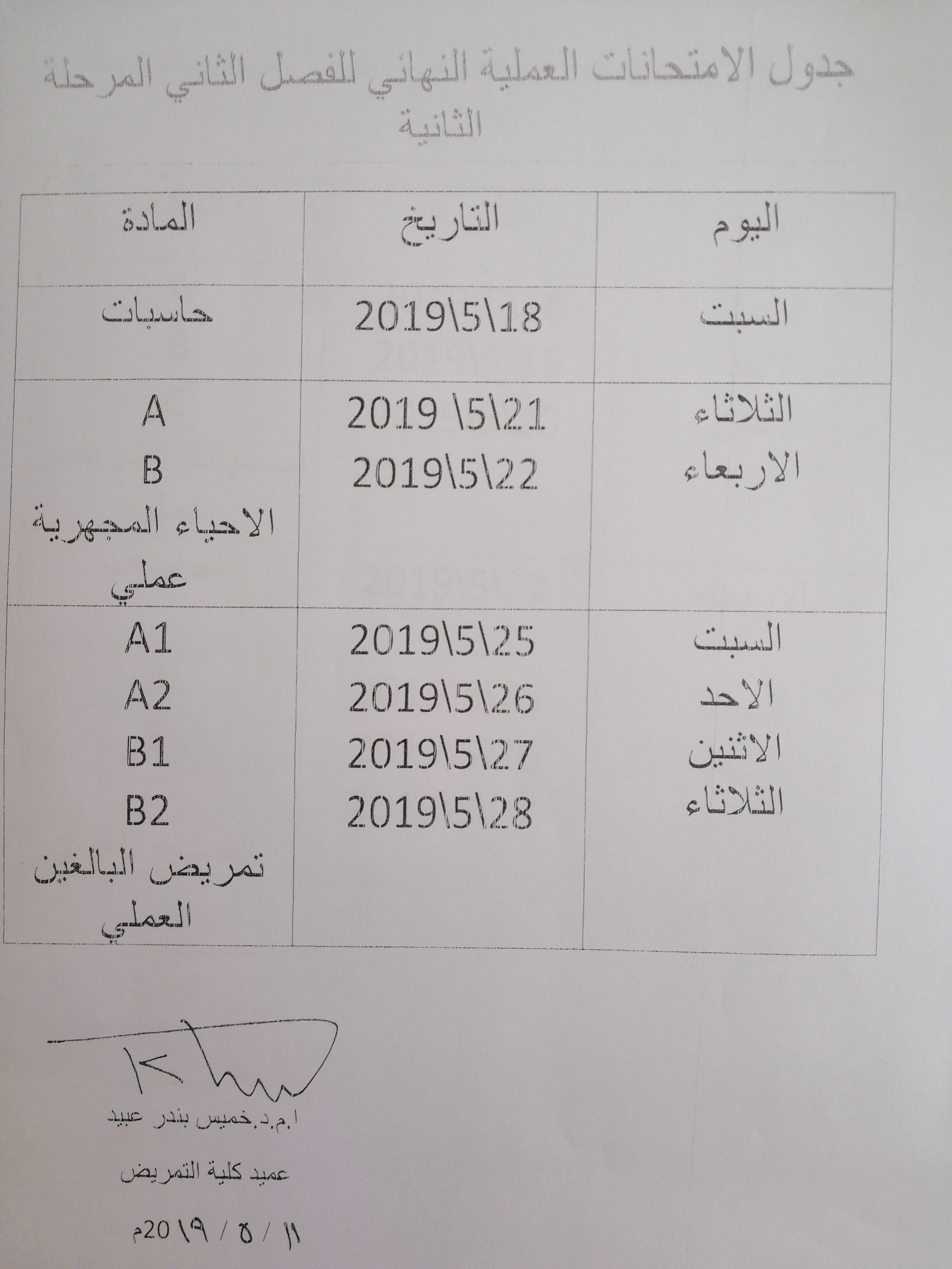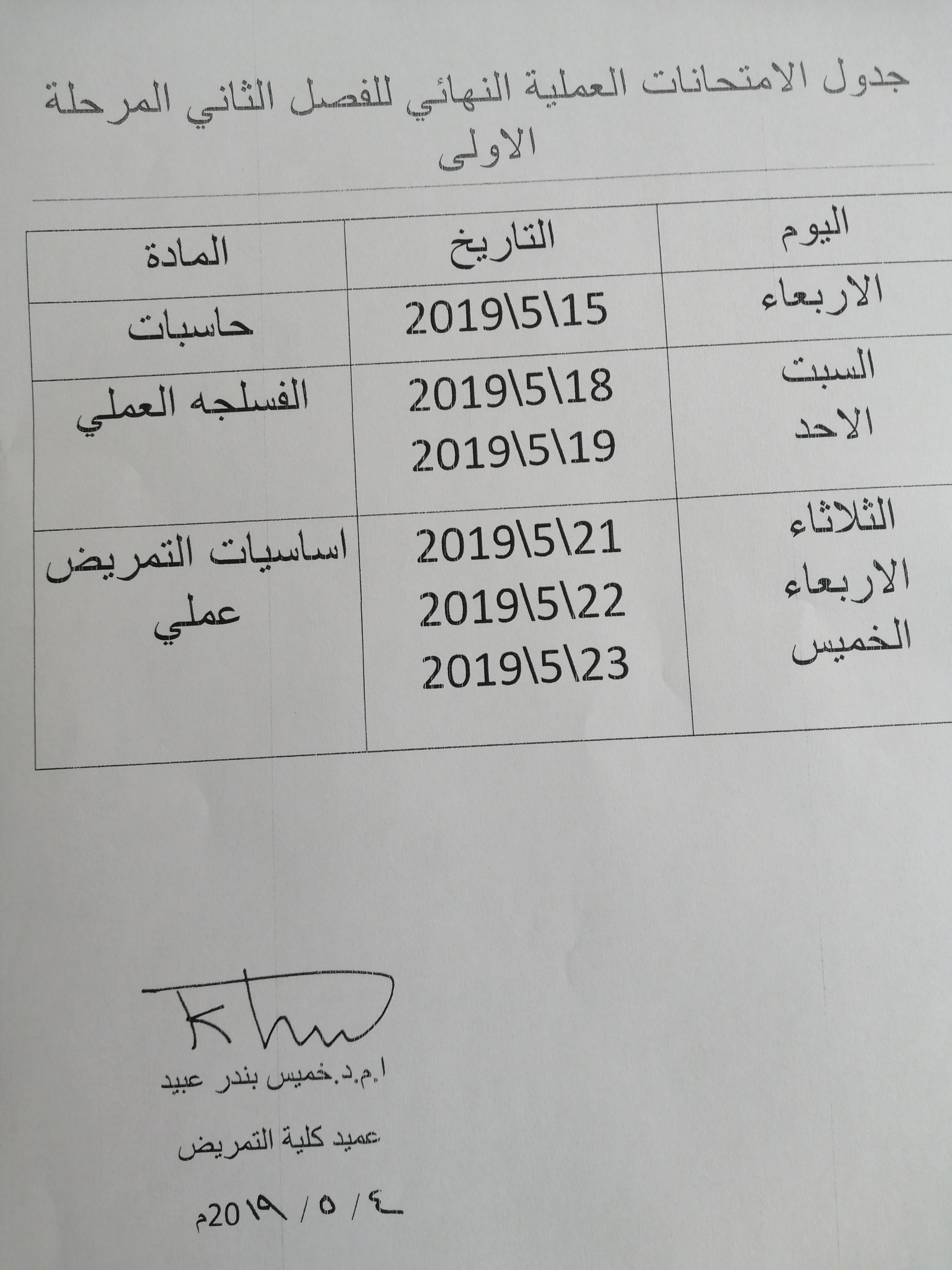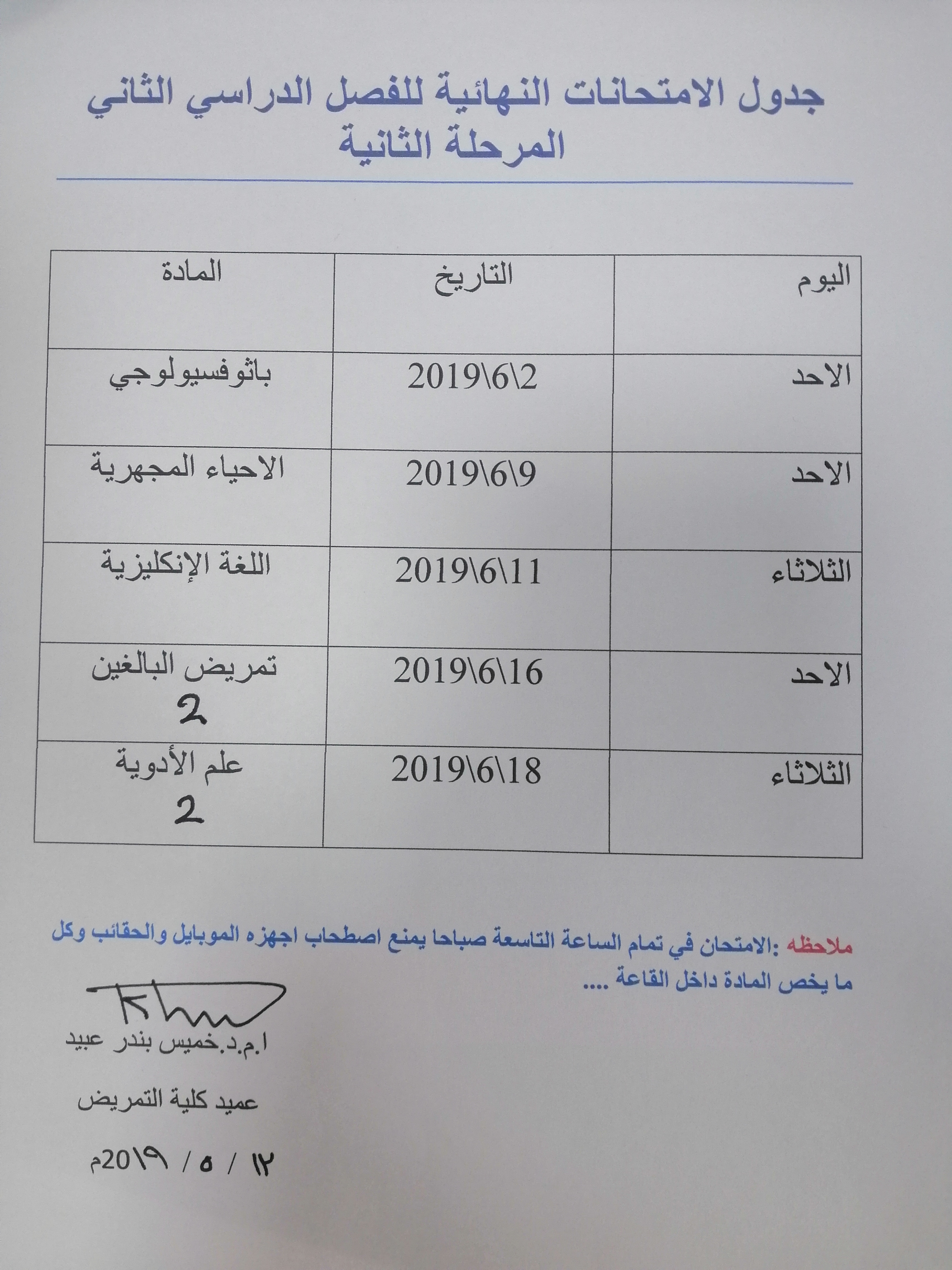 بتأريخ ٨/٥/٢٠١٩  في تمام الساعه ١٠:٣٠ص على قاعة كلية التمريض.