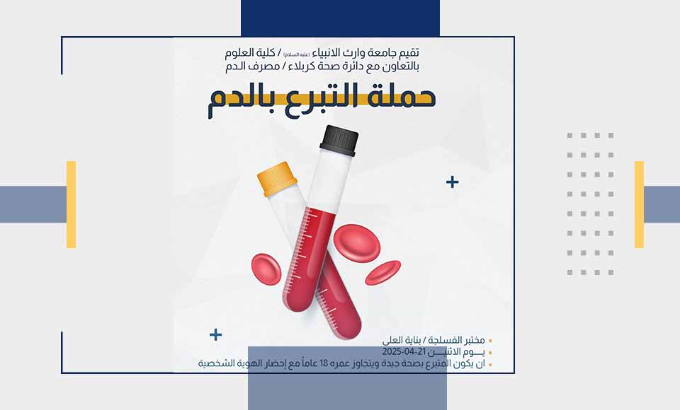 في إطار تعزيز قيم التكافل الاجتماعي والإنساني، أعلنت جامعة وارث الأنبياء (عليه السلام) عن تنظيم حملة إنسانية للتبرع بالدم، بالتعاون مع دائرة صحة كربلاء. وتأتي هذه المبادرة ضمن جهود الجامعة في دعم القطاع الصحي والمساهمة في إنقاذ أرواح المرضى والمحتاجين للدم.
